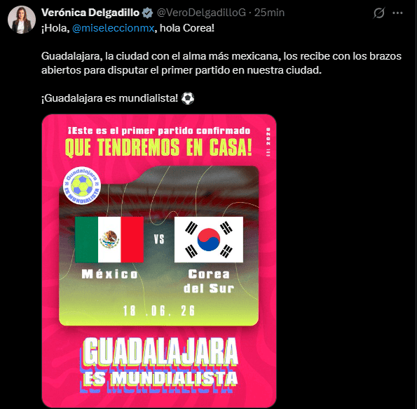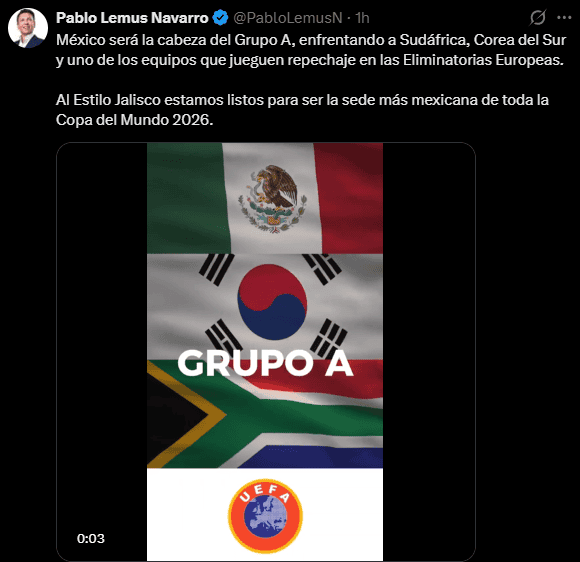 Tras darse a conocer los rivales de la Selección Mexicana para la fase de grupos del Mundial 2026, las autoridades de Jalisco expresaron su entusiasmo y reiteraron el compromiso de que Guadalajara sea una de las sedes más destacadas y mexicanas de la Copa del Mundo.El Gobernador de Jalisco, Pablo Lemus, celebró el anuncio y subrayó la relevancia que tendrá el Estado como anfitrión del torneo. Además, resaltó la composición del sector en el que competirá el Tricolor.“México será la cabeza del Grupo A, enfrentando a Sudáfrica, Corea del Sur y uno de los equipos que jueguen repechaje en las Eliminatorias Europeas. Al Estilo Jalisco estamos listos para ser la sede más mexicana de toda la Copa del Mundo 2026”, afirmó el Mandatario estatal, destacando la preparación y la proyección internacional que traerá consigo el certamen. Por su parte, la presidenta municipal de Guadalajara, Verónica Delgadillo, dio una calurosa bienvenida a la Selección de Corea del Sur, rival al que México enfrentará en su segundo partido del torneo, encuentro que se disputará en el Estadio Guadalajara.“¡Hola, @miseleccionmx, hola Corea! Guadalajara, la ciudad con el alma más mexicana, los recibe con los brazos abiertos para disputar el primer partido en nuestra ciudad. ¡Guadalajara es mundialista!”, expresó Delgadillo, resaltando el orgullo de la capital jalisciense por formar parte del evento deportivo más importante del planeta. Con el sorteo definido y el calendario en marcha, tanto el Gobierno estatal como el municipal reiteraron que Guadalajara está lista para recibir a selecciones, aficionados y visitantes de todo el mundo, consolidándose como una de las sedes clave del Mundial 2026.MF