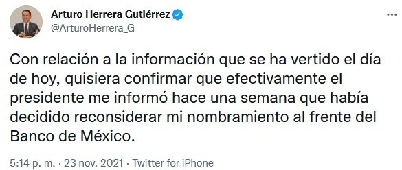El Presidente Andrés Manuel López Obrador (AMLO) informó que propondrá a Victoria Rodríguez Ceja, subsecretaria de Hacienda (SHCP) para encabezar el Banco de México.La sucesión con casi seis meses de anticipación en el Banco de México (Banxico) dio un giro ayer, lo que genera nerviosismo entre analistas y mercados.A casi mes y medio de que acabe el periodo del actual gobernador central, Alejandro Díaz de León, se dio a conocer que no será sustituido por el exsecretario de Hacienda, Arturo Herrera Gutiérrez.Así lo reveló primero el senador Ricardo Monreal, quien dijo a medios que el Jefe del Ejecutivo había retirado el nombramiento de Herrera, como lo adelantó Carlos Loret de Mola.Por la tarde, el propio Herrera manifestó que hace una semana el Presidente Andrés Manuel López Obrador le notificó que ya no sería parte del Banco de México.En su cuenta de Twitter, el actual profesor visitante de El Colegio de México (Colmex) escribió un breve mensaje confirmando los hechos."Con relación a la información que se ha vertido el día de hoy, quisiera confirmar que efectivamente el Presidente me informó hace una semana que había decidido reconsiderar mi nombramiento al frente del Banco de México", expresó.En junio pasado, luego de que López Obrador afirmara que no ratificaría a Díaz de León para un periodo más en Banxico, anunció que su lugar lo ocuparía el entonces titular de la Secretaría de Hacienda y Crédito Público (SCHP), Arturo Herrera, quien a su vez fue sustituido por Rogelio Ramírez de la O.Después, en agosto, envió al Senado el nombramiento para que fuera procesado primero ante la Comisión de Hacienda, para presentar sus cartas credenciales, lo que no sucedió.El motivo de adelantar la sucesión en Banxico, según el Presidente era mantener la estabilidad económica y evitar nerviosismo e incertidumbre.OA