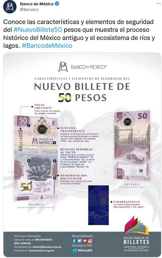 ¡Adiós a Morelos, hola ajolote! El nuevo billete de 50 pesos fue presentado este jueves por Alejandro Díaz de León, gobernador del Banco de México (Banxico).El nuevo billete de 50 pesos está hecho de polímero, el mismo material que contiene el actual que presenta el rostro de José María Morelos y Pavón, pero ahora se distingue por el ajolote mexicano que ilustra el reverso y además por su color morado.Al anverso, el billete hace alusión a la fundación de México-Tenochtitlán con el Teocalli de la Guerra Sagrada; y el Valle de México al fondo.Con este billete, se cierra el ciclo que comenzó hace 8 años con la emisión de la nueva familia G de billetes a cargo del Banxico.La nueva familia G de billetes comprende las denominaciones de 50, 100, 200, 500 y mil pesos.Fue el de 500 pesos el primero en salir en circulación el cual fue emitido el 27 de agosto de 2018; el segundo el de 200 pesos que se emitió en septiembre de 2019.En noviembre del año pasado, Banxico puso en circulación las nuevas piezas de 100 pesos con Sor Juana que ganó el concurso como el billete más bello del mundo, y el de mil pesos.OA