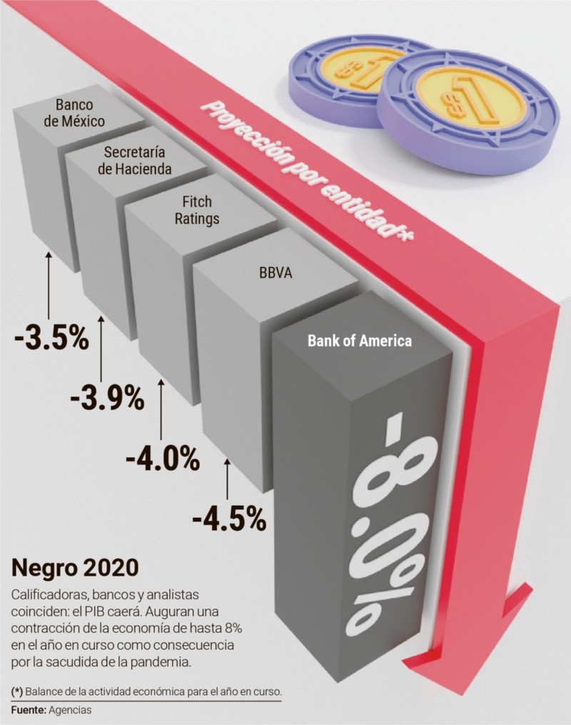 Distintas entidades financieras nacionales e internacionales auguran un panorama inestable y desfavorable para la economía mexicana en el presente año. Incluso, dista de mejorar debido a la emergencia sanitaria por coronavirus, pandemia a la que atribuyen pérdidas de hasta 8% en el Producto Interno Bruto (PIB).De acuerdo con el pronóstico de Bank of America, la economía mexicana se contraerá ese 8% este año debido al desplome de los precios del petróleo y la reducción de la actividad, una estimación que casi se duplicó luego de que esa entidad financiera informara que la baja sería de 4.5 por ciento.Bank of America, no obstante, previó que la economía mexicana crecerá 4.5% en 2021 en gran medida por una probable recuperación económica del país vecino del Norte, su principal socio comercial.Previamente, el banco BBVA estimó que la economía de México tendrá un retroceso de 4.5%, producto de la expansión del coronavirus en territorio nacional y a la interrupción de las cadenas de suministro, principalmente en la Unión Americana.“México no está aislado de las disrupciones en las cadenas de valor y será severamente afectado por el previsible desplome de la producción y la demanda en Estados Unidos”, aseveró BBVA.Proyectó que el impacto dependerá de las acciones que tome el Gobierno federal para contener el brote. “Las decisivas medidas que están tomando otros países son necesarias. Seguramente se terminarán tomando en México, entre más pronto, mucho mejor”.Casi en el mismo tenor, la calificadora Fitch Ratings informó que espera una caída en el PIB de 4%, lo que significa un drástico ajuste si se considera que el pasado 5 de marzo esperaba un crecimiento del país de uno por ciento. Calculó que en México el consumo caerá 3.6% y la inversión fija descenderá 10 por ciento.La corporación financiera, por otra parte, prevé una recuperación de la economía mexicana en 2021 con un crecimiento del PIB de 2.1 por ciento. En su Global Economic Outlook del 2 abril de 2020, aclaró que la velocidad con la que evoluciona la pandemia ha requerido otra ronda de recortes en las previsiones del PIB a nivel mundial.Hacienda y Banxico, en sintoníaLa Secretaría de Hacienda y Crédito Público (SHCP) redujo sus estimaciones de crecimiento hasta -3.9%, de acuerdo con un documento presentado en la Cámara de Diputados, alegando que “en un periodo muy reducido el panorama económico global se ha deteriorado de forma rápida y significativa”.Expertos consultados por el Banco de México (Banxico) señalaron que las expectativas para el PIB de este año auguran una caída de 3.5%. La economía mexicana se deteriora, por lo que es urgente que el Gobierno ponga en marcha un paquete de estímulos fiscales que ayude a las empresas a evitar la bancarrota y mantener sus finanzas sanas, coincidieron especialistas.Baja la calificaciónLa agencia mexicana HR Ratings bajó este miércoles la calificación de la deuda soberana de México a nivel BBB+ y mantuvo la perspectiva en “negativa”, ante una economía que podría verse “significativamente afectada en el corto y mediano plazo”.El Presidente Andrés Manuel López Obrador no coincidió con las proyecciones de crecimiento económico que planteó la Secretaría de Hacienda y Crédito Público (SHCP) que estiman una tasa negativa del PIB de -3.9 por ciento.“No existe normalidad económica, por razones obvias, todo está alterado. Yo, por ejemplo, sostengo que el precio del petróleo va a aumentar. Si hacemos un pronóstico para lo que va a suceder en el 2021, porque así es, son pronósticos para el 2021 cuando estamos en el primer trimestre del 2020, pues no se me hace correcto”.Pidió de nuevo al Banco de México que no utilice reservas en dólares para estabilizar la divisa porque “se los van a tragar y no va a tener resultado”, ya que, en su opinión, “así terminaron de destruir la economía de Argentina”.Dijo que no teme un escenario de desempleo masivo en México, ya que el plan de reactivación económica que presenta hoy está enfocado a paliar esa situación.se desplomará el flujo de remesas hacia México este año, si el impacto económico en EU de la crisis por COVID-19 supera los efectos de la recesión financiera de 2008-2009, anticipó BBVA. Los envíos de dólares crecieron 10.5% en febrero.Gobiernos de 22 estados del país dieron a conocer los planes económicos para contener las afectaciones debido a la emergencia sanitaria por el coronavirus.Los gobernadores anunciaron apoyos para paliar la crisis por casi 20 mil 077 millones de pesos (MDP). Baja California, Chiapas, Chihuahua, Nayarit, Querétaro, Tabasco y Tlaxcala no informaron sobre su estrategia; Tamaulipas, Yucatán y Puebla tienen propuestas en puerta, pero no han sido aprobadas.En Jalisco, por ejemplo, la Secretaría estatal de la Hacienda publicó el fallo de adjudicación de la deuda de mil MDP para atender el impacto económico. Serán dos créditos, uno con Banorte, por 800 MDP, y con Banco Santander, por 200 MDP, con tasas de 6.98% y 7.03%, respectivamente.Una cifra sin precedentes de casi 10 millones de personas ha perdido su trabajo en Estados Unidos (EU) en las últimas dos semanas en medio del paro de actividades ocasionado por las medidas para contener la expansión del coronavirus.El Departamento de Trabajo de ese país informó que más de 9.92 millones de personas solicitaron el subsidio por desempleo, algo inaudito en la economía estadounidense.Hace sólo un mes, la mayor economía del mundo registraba un índice de desempleo de 3.5%, la más baja en medio siglo.Algunos economistas calculan que la tasa de desempleo en la Unión Americana podría llegar a 20%, el doble de lo registrado en octubre de 2009, cuando el país recién llevaba tres meses de recuperación.Lo anticipado por la FederaciónEl Gobierno federal adelantará cuatro meses los apoyos otorgados a menores de edad con discapacidad. Aplicará s