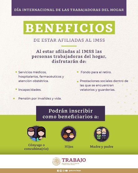 A dos años de haber iniciado la incorporación de las Personas Trabajadoras del Hogar al Instituto Mexicano del Seguro Social (IMSS), se tiene un registro de 27 mil 295 personas. Esto representa una cantidad siete veces más a quienes fueron afiliados bajo la modalidad 34 "Trabajadores Domésticos" en abril de 2019, informó la Secretaría del Trabajo y Previsión Social (STPS). En el marco del Día Internacional de las Personas Trabajadoras del Hogar, celebrado cada 30 de marzo, en conjunto con el IMSS, la STPS recordó que este ramo laboral tienen derecho a los cinco seguros que da el Instituto: de Enfermedades y Maternidad; Riesgos de Trabajo; Invalidez y Vida; Retiro, Cesantía en Edad Avanzada y Vejez; y Guarderías y Prestaciones Sociales."En este sentido, los trabajadores tienen derecho a atención médica, farmacéutica y hospitalaria; pago de incapacidades por enfermedad general o riesgos de trabajo; generar ahorro para el retiro o pensión en caso de invalidez para el asegurado y sus beneficiarios legales; y prestaciones como estancias infantiles y actividades de esparcimiento", señalaron las dependencias.Además, los beneficios se extienden a los miembros de la familia de los trabajadores, donde al mes de febrero se han registrado 22 mil 673 beneficiarios, de los cuales 20 mil 7 son hijos, siete mil 465 cónyuges, concubina o concubinario, y cuatro mil 775 madre o padre, de acuerdo con lo establecido en la ley vigente.Los 27 mil 295 trabajadores fueron afiliados con un salario diario de 210 pesos, informó la Secretaría del Trabajo en un comunicado de prensa, lo cual significa siete veces más que el número de puestos registrados en el esquema anterior en 2019, cuando éste registró un máximo histórico.De acuerdo con la distribución a nivel nacional, el 63% de las Personas Trabajadoras del Hogar laboran en la Ciudad de México, Estado de México, Sonora, Jalisco, Nuevo León, Veracruz, Sinaloa, Coahuila, Baja California Norte y Chihuahua.Dentro de la numeraria de las dependencias, destacaron que, de los más de 27 mil trabajadores del hogar vigentes, el 68% son mujeres de 49 años en promedio, mientras que los hombres representan el 32% en un rango de edad de 54 años."De acuerdo con la Encuesta Nacional de Ocupación y Empleo (ENOE), el 88% de las personas trabajadoras del hogar ganan dos salarios mínimos o menos, respecto a la jornada de trabajo; 42% labora más de 35 horas a la semana; el 96% labora sin contrato y el 69.5% no tiene prestaciones", precisó.Comentó que, por motivo de las condiciones laborales de las Trabajadoras del Hogar, es importante contar con el apoyo de las personas empleadoras, quienes constituyen una pieza fundamental para dignificar las condiciones laborales de este grupo, toda vez que no puede hablarse de trabajo decente si no se cuenta con salarios remuneradores, condiciones de seguridad y salud en el trabajo, sin prácticas discriminatorias, entre otras.NR
