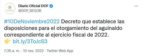 El Gobierno de México publicó hoy jueves el decreto que establece las disposiciones para el otorgamiento del aguinaldo a los trabajadores burócratas correspondiente a este año.El documento, publicado en el Diario Oficial de la Federación (DOF), señala que el aguinaldo será de 40 días de salario y se deberá entregar a partir del 14 de noviembre a los servidores públicos de las Dependencias y Entidades, cuya relación jurídica de trabajo se regula por la Ley Federal de los Trabajadores al Servicio del Estado, Reglamentaria del Apartado B del Artículo 123 Constitucional.En forma extensiva, "como un acto jurídico del Ejecutivo Federal, orientado en principios de justicia y equidad", se entregará también al personal operativo de confianza de las Dependencias y Entidades; el personal de enlace y de mando de las Dependencias y Entidades, así como el personal del Servicio Exterior Mexicano que se encuentre en funciones en territorio nacional.Asimismo, al personal del Servicio Exterior Mexicano y asimilado a este que se encuentre en funciones en las representaciones de México en el extranjero; el personal militar en activo; las personas físicas contratadas para prestar sus servicios profesionales bajo el régimen de honorarios con cargo a recursos del capítulo de Servicios Personales del Clasificador por Objeto del Gasto para la Administración Pública Federal, que prestan sus servicios a las Dependencias y Entidades y al Servicio Exterior Mexicano.El Decreto establece que también deberá otorgarse el aguinaldo a las personas que reciban haberes de retiro, pensión militar, pensión civil, pensión de gracia o los deudos de esas personas a quienes se les haya otorgado una pensión del Instituto de Seguridad y Servicios Sociales de los Trabajadores del Estado o con cargo al erario federal, quienes recibirán la gratificación correspondiente a cada concepto al que tengan derecho.En este inciso se incluye a los veteranos de la Revolución que disfruten de una pensión con cargo al Instituto de Seguridad y Servicios Sociales de los Trabajadores del Estado (ISSSTE) y de cuota adicional con cargo al erario federal, quienes recibirán la gratificación correspondiente por cada uno de esos conceptos a los que tengan derecho."Será equivalente a cuarenta días, sobre la base de cálculo y en los términos que se establezcan en los lineamientos específicos a que se refiere el artículo Decimosegundo de este ordenamiento", señala el documento suscrito por el presidente Andrés Manuel López Obrador y el secretario de Hacienda, Rogelio Ramírez de la O.OF
