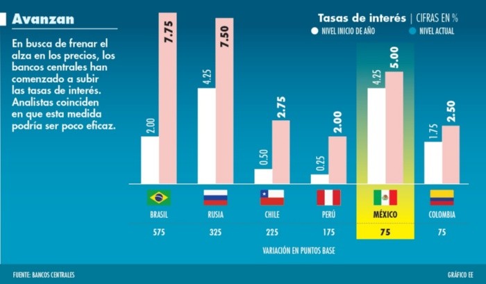El llamado a los bancos centrales desde el FMI ha sido que se mantengan alerta sobre los riesgos de un desanclaje en las expectativas de inflación, conducido por la persistencia de los choques transitorios que están incrementando los precios de commodities como los energéticos.Entre los siete bancos centrales de economías emergentes que movieron su tasa en las últimas tres semanas, el Banco de México fue el que aplicó el incremento más moderado, de un cuarto de punto.En el extremo se encuentran los bancos centrales de Brasil, Chile y Rusia, que dirigieron incrementos de 150, 125 y 75 puntos base en un sólo movimiento, esto el 28, 14 y 25 de octubre, respectivamente.De acuerdo con el exconsejero económico del Fondo Monetario Internacional (FMI) Raghuram Rajan, la estrategia de los bancos centrales en el contexto mundial de alta inflación, no es sencilla.“Ningún banco central quiere ser señalado por dañar la débil recuperación económica con su estrategia para enfrentar el contexto mundial de alta inflación. No es una decisión sencilla para la Reserva Federal de Estados Unidos, y menos para los bancos centrales de economías emergentes y en desarrollo que han sido las más dañadas por la pandemia y sus secuelas”, refirió en el podcast oficial más reciente del FMI.Ese parece ser el caso de México. De acuerdo con el vicepresidente de análisis económico para América Latina de Scotiabank, Eduardo Suárez Mogollón, “la situación para el Banco de México es complicada porque la economía transitó por una contracción en el tercer trimestre que desaceleró la recuperación. Trae brechas de producción sectorial que no han cerrado por completo y una inflación secuencial muy alta que genera el riesgo de contaminación en la fijación de precios y en expectativas”.Sin tener al crecimiento económico como un objetivo explícito del banco central mexicano, sí debe procurar la estabilidad de precios al menor costo posible para la economía, parafraseó al exgobernador Agustín Carstens.No ha menguado con restricciónDe acuerdo con la economista para México en BNP Paribas, Pamela Díaz Loubet, una mayor agresividad en el alza de las tasas tampoco ha sido la vía para contener la inflación ni sus expectativas.Díaz Loubet reconoció que un aumento de tasas no limitará la inflación porque tal como recalcó la Junta de Gobierno en su anuncio monetario del jueves, donde llevó la tasa a 5%, el origen principal de estas presiones es externo y en cambio sí podría haber cierto impacto de la normalización de tasas sobre la actividad económica.México mantiene una de las siete inflaciones de mercados emergentes más altas, de 6.2% anual al mes de octubre, con expectativas para el fin de año de una inflación que estará por encima de 7 por ciento.La estratega de BNP Paribas tomó los casos de Brasil y Rusia para explicar que aún siendo los emergentes más agresivos con las alzas de tasas, no han logrado menguar la inflación.Brasil tiene una inflación de 11.1% anual a octubre y una tasa que se ha incrementado en 575 puntos base en un lapso de ocho meses.La observación de Díaz Loubet se confirma también en el caso de Rusia que acumula una variación anual de 7.4% en la inflación, se ubica como la sexta más alta de los emergentes observados y destaca también por ser uno de los bancos centrales que más ha apretado la política monetaria en el año, con alzas acumuladas de 325 puntos base en el año.No es hiperinflaciónEl llamado a los bancos centrales desde el FMI ha sido que se mantengan alerta sobre los riesgos de un desanclaje en las expectativas de inflación, conducido por la persistencia de los choques transitorios que están incrementando los precios de commodities como los energéticos.La consejera económica del FMI, Gita Gopinath, explicó en el mismo podcast que el mundo se encuentra operando en un ambiente de alta inflación que no debe confundirse con hiperinflación.Acotó que la recomendación a los bancos centrales es actuar rápidamente y de forma oportuna considerando el tiempo que toma a la economía responder a la política monetaria.El también exgobernador del Banco Central de India, y actual profesor distinguido de Finanzas en la Universidad de Chicago Booth School, admitió que esta recuperación económica débil y el ambiente de alta inflación, son un claro reto para las autoridades económicas.Este lunes, la presidenta del Banco Central Europeo, Christine Lagarde, aseguró que no endurecerá la política monetaria, pues eso podría ahogar la recuperación de la zona euro. En una intervención ante legisladores de la Unión Europea, admitió que el alza de los precios durará más de lo esperado.
