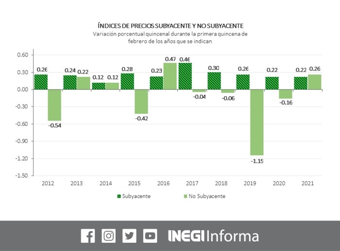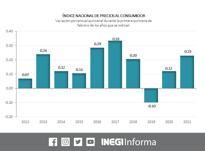 El Instituto Nacional de Estadística y Geografía (Inegi) informó este miércoles que la inflación en la primera quincena de febrero mantuvo su tendencia al alza debido principalmente al incremento en el precio de las gasolinas y el gas doméstico LP.En la primera mitad de febrero, el Índice Nacional de Precios al Consumidor registró una inflación quincenal de 0.23% así como una inflación anual de 3.84%, la tasa más alta desde octubre de 2020, con lo que se acerca al 4.0%, nivel superior del rango objetivo del Banco de México.Analistas económicos de Banorte señalan que es muy probable que la tendencia a la alza en la inflación se extienda ante las presiones en los precios de las materias primas por el cierre de actividades en el sur de Estados Unidos debido a las heladas de la semana pasada. "Ante recientes presiones en los precios de las materias primas, destacando sobre todo la fuerte disrupción en energéticos a nivel global la semana pasada por el cierre de actividades en el sur de Estados Unidos debido a las heladas, es muy probable que la dinámica alcista pudiera extenderse", estimaron.Entre los bienes y servicios cuyos precios al alza tuvieron mayor incidencia en la inflación, destacan; las gasolinas de bajo y alto octanaje con incrementos quincenales de 1.96% y 1.87% respectivamente; gas doméstico LP, 1.09%; papa y otros tubérculos, 4.77%; pollo, 1.19%; plátanos 6.43%; automóviles, 0.65%; loncherías, fondas, torterías y taquerías, 0.26%; huevo, 1.37%; y alimentos para mascotas, 1.84%.Por el contrario, los genéricos cuyos precios a la baja contribuyeron más a contener la inflación, fueron: el jitomate con una disminución quincenal de 20.68%; cebolla, -9.20%; aguacate, -5.24%; nopales, -6.07%; productos para cabello, -1.57%; calabacita, -5.77%; electricidad, -0.23%; chile poblano, -8.98%; melón, -5.58%; otras verduras y legumbres, -1.13%.El índice de precios subyacente, que no incluye los bienes y servicios cuyos precios son más volátiles, tuvo un aumento de 0.22% quincenal y de 3.84% anual; por su parte, el índice de precios no subyacente se incrementó 0.26% quincenal y 3.85% anual.Al interior del índice de precios subyacente, los precios de las mercancías crecieron 0.30% quincenal y los de los servicios 0.13%.Dentro del índice de precios no subyacente, los precios de los productos agropecuarios disminuyeron 0.69% quincenal, mientras que los precios de los energéticos y tarifas autorizadas por el gobierno subieron 0.94% en igual periodo.NR
