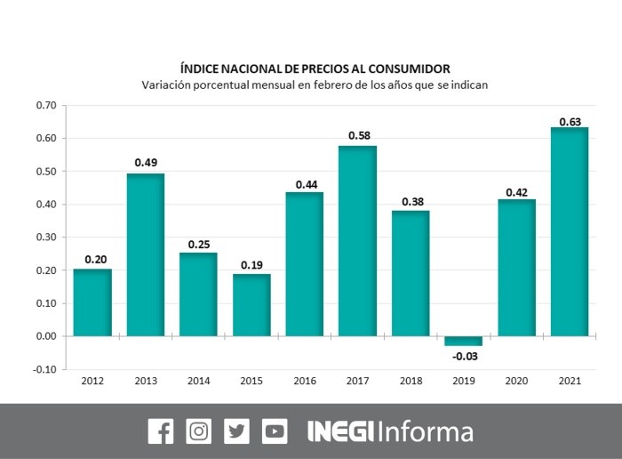 La inflación anual continua su tendencia al alza por segundo mes consecutivo, impulsada principalmente por los incrementos de los precios en gasolinas y gas LP, por lo que el indicador podría superar el 4%, meta objetivo del Banco de México, antes de lo esperado.El Instituto Nacional de Estadística y GeografíaÍndice Nacional (Inegi) informó esta mañana que el Índice Nacional de Precios al Consumidor registró una inflación de 0.63% en febrero de 2021 respecto al mes inmediato anterior, que constituye el dato más elevado para un mismo mes comparable desde 2001. Con este resultado la inflación anual se ubicó en 3.76%, superando el 3.72% estimado por los especialistas, constituyéndose en la mayor tasa desde octubre del año pasado."El resultado pone en duda la prolongación del ciclo de recortes a la tasa de referencia en la decisión que Banxico anunciará el próximo 25 de marzo, pues durante los primeros días de este mes los precios de los energéticos han continuado escalando, lo que aumenta las probabilidades de que la inflación anual cruce el umbral de 4.0% antes de abril", comentó Daniel Arias, analista económico de Monex.Entre los bienes y servicios cuya alza de precios incidieron más en la inflación en febrero, fueron: gasolinas de alto y bajo octanaje con un alza mensual de 4.59% y 5.08% respectivamente; gas doméstico LP, 4.28%; papa y otros tubérculos, 15.98%; pollo, 2.43%; plátanos, 11.96%; limón, 22.07%; vivienda propia, 0.18%; loncherías, fondas, torterías y taquerías, 0.44%; tortilla de maíz, 1.01%.Por el contrario, entre los genéricos cuya baja de precios contribuyó más a contener la inflación general, se encuentran: jitomate con una disminución mensual de 29.9%; cebolla, -15.37%; nopales, -7.41%; aguacate, -4%; chile poblano, -13.72%; productos para el cabello, -1.81%; otros chiles frescos, -5.59%; electricidad, -0.23%; azúcar, -1.10%; chile serrano, -5.30%.El índice de precios subyacente, que no incluye los bienes y servicios cuyos precios son más volátiles, presentó un incremento mensual de 0.39% y anual de 3.87%; por su parte, el índice de precios no subyacente aumentó 1.36% mensual y 3.43% anual.Dentro del índice de precios subyacente, a tasa mensual, los precios de las mercancías crecieron 0.52% y los de los servicios 0.25%.Al interior del índice de precios no subyacente, los precios de los productos agropecuarios bajaron 0.22% mensual, mientras que los precios de los energéticos y tarifas autorizadas por el gobierno subieron 2.50% mensual.NR