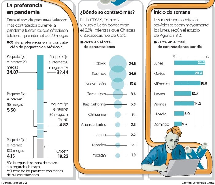De marzo a mayo, las contrataciones de internet y telefonía fija se incrementaron 20 por ciento, debido a que la Jornada de Sana Distancia, que arrancó el 23 de marzo, obligó a la población a permanecer en sus hogares para evitar los contagios del coronavirus en el país, de acuerdo con datos de la consultora de telecomunicaciones Agencia B12 México. “De marzo a mayo se dio un incremento considerable con respecto a años anteriores aproximadamente un 20 por ciento”, explicó David Pérez, country manager de Agencia B12 México. Desde finales de marzo, el trabajo en oficinas, las clases y la mayoría de las actividades de entretenimiento, migraron completamente a los hogares, lo que provocó que las personas contrataran servicios de telecomunicaciones para poder hacer home office o estudios online, así como para la diversión como videojuegos y plataformas de streaming, coincidieron expertos. Durante el periodo de marzo a mayo, siete de cada 10 contrataciones las concentraron cuatro entidades: la Ciudad de México con 24.5 por ciento, Estado de México con 24 por ciento, Nuevo León con 13.6 por ciento y Tamaulipas con 8.6 por ciento de acuerdo con un reporte de la Agencia B12. Ante esto, durante el segundo trimestre de este año, América móvil reportó en México que sus ingresos de banda ancha fija crecieron 1.8 por ciento, mientras que sus entradas en su plataforma de línea fija bajaron apenas 0.5 por ciento, en comparación con la caída de 1.4 por ciento del mismo periodo de 2019. Otro caso fue Izzi, que durante el segundo trimestre de 2020 registró ventas por 11 mil 308.8 millones de pesos, un aumento de 10.7 por ciento en el segmento que incluye televisión de paga, internet fijo y telefonía fija. David Pérez explicó que, aunque el COVID-19 impulsó el servicio de telefonía fija, el reto será que las familias mantengan el servicio cuando se termine la pandemia. Por su parte, Jorge Bravo, presidente de la Asociación Mexicana de Derecho a la Información (Amedi), coincidió en que el reto será evitar que se cancelen las líneas fijas y esto dependerá de que las personas comprueben la importancia que tiene este servicio, pues en la medida en que se regrese a la nueva normalidad, la telefonía móvil retomará su dinámica. “Se vio la importancia que tienen las redes fijas, sobre todo la fibra óptica. Aquellos hogares que no tenían una conexión de banda ancha fija la contrataron, otros incluso incrementaron su velocidad su capacidad del internet (…) y creo que lo importante será que esto se mantenga que no se reduzca”, comentó Bravo. Al respecto, Jorge Fernando Negrete, director de Digital Policy Law, aseguró que en su opinión los servicios de telefonía fija llegaron para quedarse, al recobrar la relevancia que tienen para continuar con actividades laborales, escolares y de entretenimiento. “La realidad es que siempre es mucho más estable y mucho más eficiente la línea fija y la parte positiva de esto es que el despliegue de infraestructura física permite reforzar la vértebra de la transmisión de datos en la ciudad. El efecto positivo de la pandemia fue la inmersión digital de los ciudadanos que fue positiva”, dijo Negrete. Se desconecta prepago y pospago De abril a junio de este año, América Móvil registró una desconexión de 1.7 millones de suscriptores de prepago y 112 mil clientes de pospago en su plataforma móvil, debido a las dificultades que enfrentaron los usuarios para efectuar recargas con la mayoría de las tiendas y centros de atención al cliente cerrados por las medidas de confinamiento y a la falta de recursos. Negrete explicó que la desconexión también se debió a la sustitución de la comunicación móvil a la fija, por ello los operadores reportaron una clara disminución en el consumo de datos al existir una restricción de movilidad, además de las bajas ventas de equipos, al no contar con ningún estímulo para cambiar de dispositivo. Sin embargo, aseguró que estos segmentos recobrarán su nivel en diciembre o en la medida que se regrese a la nueva normalidad. “La gente sustituyó la comunicación móvil por el internet de casa, el internet fijo y todos sus servicios. Claramente hubo una baja con los operadores porque disminuyó el consumo de datos, por un lado, pero el otro caso fue que hubo menos venta de dispositivos móviles”, expresó. Por otra parte, COVID-19 provocó que todas las actividades migraran a la parte digital, por lo que el cierre de la brecha digital y el acceso a las herramientas tecnológicas serán indispensables y equiparables a un derecho humano. “Es importante cerrar la brecha digital. No puede haber mexicanos desconectados, sin equipos tecnológicos. Se tiene que digitalizar más el gobierno que fue el que realmente quedó paralizado, no puedes dejar de tener computadoras, desconectar hospitales, escuelas, centros público, ojalá nuestras autoridades lo entiendan”, aseveró el presidente de la AMEDI.