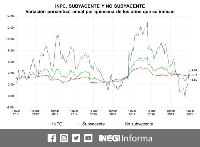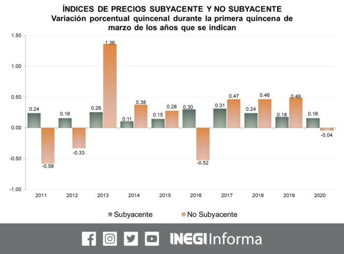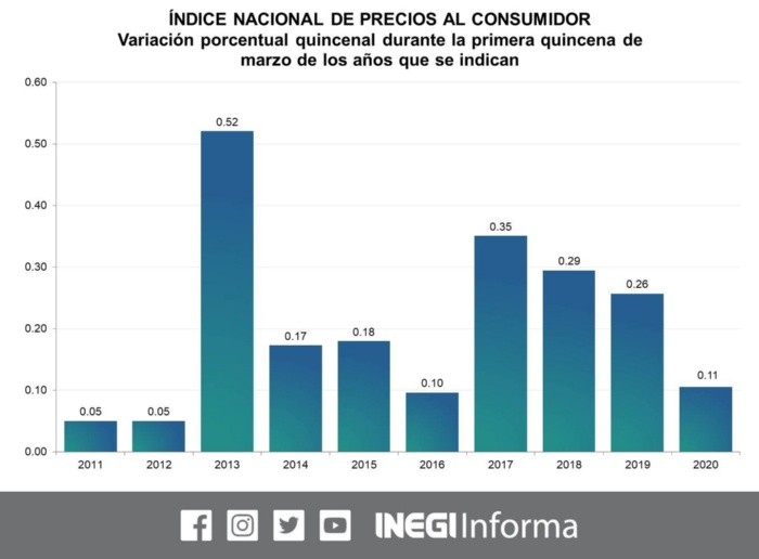 La disminución en los precios de la gasolina de bajo octanaje, el jitomate, la cebolla y el tomate, contribuyeron a contener la inflación en la primera mitad del presente mes, de acuerdo con los datos más recientes dados a conocer por el Inegi.En la primera quincena de marzo de 2020 el Índice Nacional de Precios al Consumidor presentó un alza de 0.11 por ciento respecto a la quincena inmediata anterior, el nivel más bajo para dicho periodo en los últimos cuatro años.Lo anterior trajo como consecuencia que la inflación anual se ubicara en 3.71%, tasa inferior al 3.87% reportada en la segunda quincena de febrero, manteniéndose dentro del rango objetivo del Banco de México, de 3% más/menos un punto porcentual.Entre los bienes y servicios cuya baja de precios contribuyeron más a contener la inflación, fueron: el jitomate con una baja en la primera quincena de marzo de -3.79%; tomate verde, -7.70%; cebolla, -6.99%; gasolina de bajo octanaje, -0.25%, servicios turísticos en paquete, -3.21%; nopales, -10.4%; melón, -6.16%; carne de cerdo, -0.59%; y transporte aéreo, -2.02%.Los genéricos cuya alza de precios contribuyeron más a la inflación en la primera mitad de marzo, fueron: el pollo, con una alza quincenal de 2.03%; loncherías, fondas, torterías y taquerías, 0.39%; aguacate, 8.36%; vivienda propia, 0.15%; limón, 13.85%; papa, 4.03%; gas doméstico LP, 0.45%; calabacita, 7.30%; chile serrano, 7.67%; refrescos envasados, 0.28%.Entre las entidades que reportaron una disminución en el nivel general de precios durante la primera mitad de marzo, destacan: Tlaxcala con una baja quincenal de -0.4%; Hidalgo, -0.18%; Guerrero, -0.16%; Zacatecas y Ciudad de México, -0.6%, respectivamente.Por el contrario, los estados que reportaron la mayor inflación en el periodo de referencia, fueron: Yucatán con una alza quincenal de 0.78%; Chiapas, 0.51%; Oaxaca, 0.50%; Querétaro, 0.39%; y Baja California, 0.38%.El índice de precios subyacente, que no incluye los bienes y servicios cuyos precios son más volátiles, aumentó 0.16% quincenal y 3.60% anual; por su parte, el índice de precios no subyacente disminuyó -0.04% quincenal y subió 4.04 por ciento anual.Al interior del índice de precios subyacente, los precios de las mercancías se incrementaron 0.19% y los de los servicios 0.12% quincenal.Dentro del índice de precios no subyacente, los precios de los productos agropecuarios descendieron -0.08 por ciento y los de los energéticos y tarifas autorizadas por el Gobierno -0.01 por ciento quincenal.OF