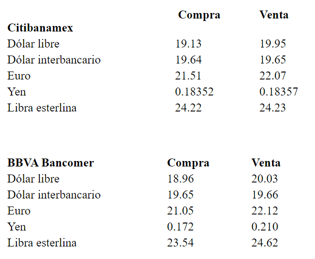 Este jueves, el dólar libre inicia la sesión con una baja de once centavos respecto al cierre de ayer, para venderse hasta en 20.03 pesos y se adquiere en un mínimo de 18.96 pesos, en bancos de la Ciudad de México.De acuerdo con Ci Banco, el peso mexicano continúa con el optimismo y buen ánimo conforme siguen despejándose algunas de las principales dudas que afectaron a la moneda en el mes de agosto.Por otra parte, el Banco de México (Banxico) informa en el Diario Oficial de la Federación (DOF) que el tipo de cambio para solventar operaciones denominadas en moneda extranjera pagaderas en el país se ubica en 19.7806 pesos por dólar.En tanto, las Tasas de Interés Interbancarias de Equilibrio (TIIE) a 28, 91 y 182 días se ubican en 8.2350, 8.1850 y 8.0200 por ciento, en ese orden, la primera con pérdida de 0.005, la segunda con ganancia de 0.005puntos porcentuales, y la tercera sin cambios.AC