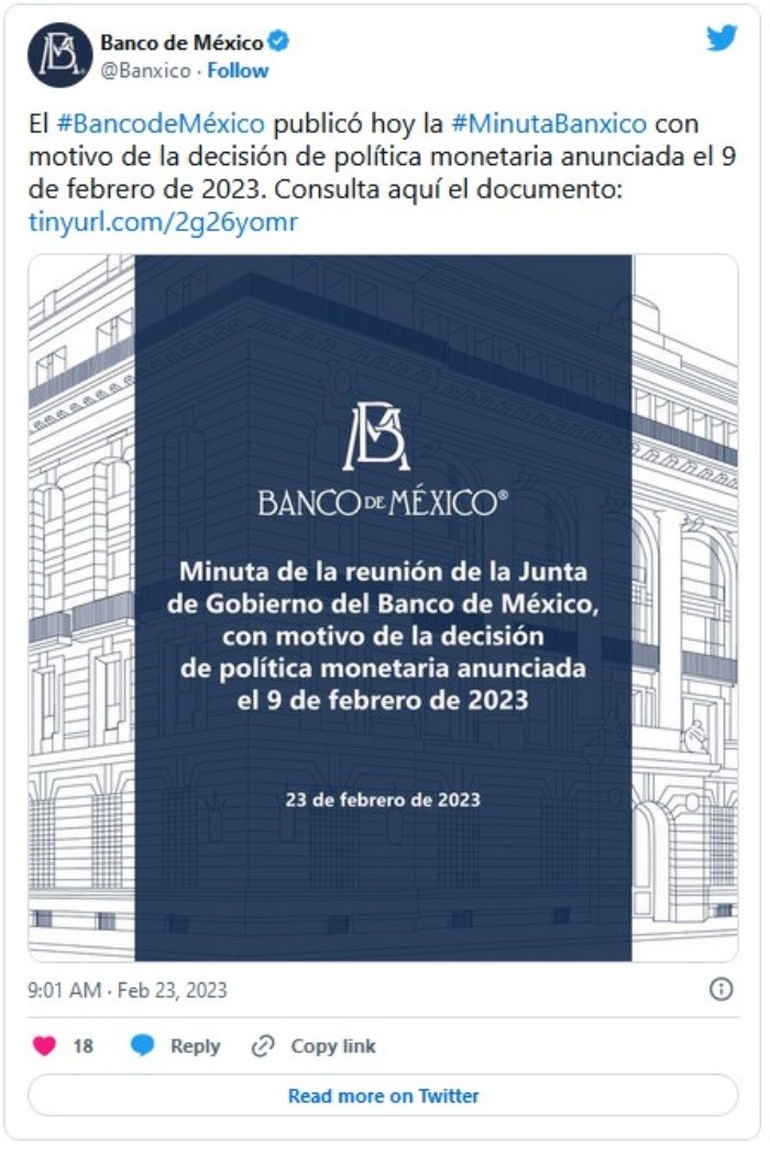 El Banco de México (Banxico) consideró "preocupante" la persistencia de los niveles altos de inflación en el país, en particular de la subyacente, que alcanzó un nivel de 8.45 % en enero, según reveló este jueves una minuta de su Junta de Gobierno."Todos consideraron preocupante que la inflación subyacente continúe en niveles altos y mantenga una mayor persistencia a la esperada", indicó el texto del banco central.Los miembros del Banxico coincidieron en que hay "un proceso de desinflación más lento de lo previsto", por lo que "los pronósticos para las inflaciones general y subyacente se ajustaron al alza para todo el horizonte".Esta minuta contrasta con la publicada el 5 de enero, cuando la Junta de Gobierno "destacó la disminución en las expectativas de inflación de corto plazo".En cambio, los integrantes del banco autónomo reconocieron ahora que el alza de los pronósticos responde a la "persistencia de la inflación y a mayores presiones a las anticipadas en las mercancías alimenticias y en los servicios"."Todos recalcaron que el balance de riesgos para la inflación se mantiene sesgado al alza", advirtió el texto.El reporte corresponde a la reunión del 9 de febrero, cuando la Junta de Gobierno elevó la tasa de interés en 50 puntos base al 11 %, el mayor nivel en su historia, lo que representa el decimocuarto incremento consecutivo ante los niveles de inflación más altos en dos décadas.En la sesión, el Banxico previó que la inflación general promedie un 4.9 % anual en el último trimestre de 2023 tras la expectativa anterior de 4.2 por ciento.Horas antes de difundirse la minuta, el Instituto Nacional de Estadística y Geografía (Inegi) reportó que la inflación general descendió en la primera quincena de febrero hasta el 7.76 % anual.JM