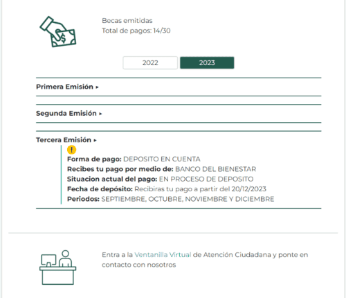 ¿Estás a punto de recibir tu beca Benito Juárez? Aquí te decimos cómo usar el buscador de estatus para saber cuándo son los depósitos de la beca en este 2024.Para saber qué día comienzan los depósitos de la beca es necesario utilizar el buscador de estatus. Al ingresar al sitio web debes de ingresar tu CURP.En la siguiente ventana, se deberá buscar la sección "Becas emitidas", seleccionar el último año y luego hacer clic en "Tercera emisión". Ahí se mostrará la información del pago correspondiente y la situación del depósito.La Coordinación Nacional de Becas para el Bienestar Benito Juárez anunció que en 2024 habrá solo dos pagos: el primero en enero/febrero que corresponde al pago de los primeros seis meses, y el segundo será en noviembre que corresponde a los últimos cuatro meses de la beca.Mantente al día con las noticias, únete a nuestro canal de WhatsApp aquí: https://whatsapp.com/channel/0029VaAf9Pu9hXF1EJ56MV