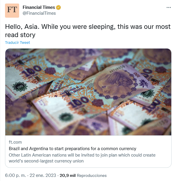 Brasil y Argentina dieron a conocer su intención de tener una moneda común que llevará el nombre de "El Sur", en honor a América del Sur, según información que dio a conocer el Financial Times.Esta unión monetaria será la segunda con más importancia, según lo informa el medio de origen británico.El proyecto tiene como objetivo unir a más países de América Latina, aunque la moneda sería utilizada solamente para el comercio internacional.Por lo anterior, el peso argentino y el real brasileño seguirán su función únicamente en su país. OF