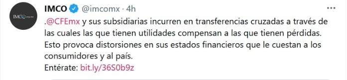 El Instituto Mexicano para la Competencia (IMCO) alertó que la Comisión Federal de Electricidad (CFE) y sus empresas productivas subsidiarias distorsionan sus resultados financieros y operativos, lo que afecta la toma de decisiones y la competencia en el sector eléctrico.El organismo detalló que la CFE y sus subsidiarias "incurren en subsidios cruzados mediante los cuales las subsidiarias que presentan utilidades compensan a aquellas que tienen pérdidas, en contra del espíritu de los Términos para la Estricta Separación Legal (TESL) publicados en 2016".Agregó que distorsionar los resultados financieros evita que se refleje la situación real de las distintas subsidiarias de la CFE, ya que ocultan las transferencias de recursos o subsidios cruzados."Esto no sólo tiene implicaciones negativas en términos de transparencia, sino que afecta los incentivos de las distintas subsidiarias que son partícipes, así como el funcionamiento y la competencia en el mercado eléctrico", advirtió.Añadió que también se ven afectados los hogares y empresas mexicanas que enfrentan mayores precios de la electricidad debido a una menor competencia en el sector.El Instituto Mexicano para la Competencia señaló que distorsionar los subsidios cruzados afecta la toma de decisiones de las subsidiarias, pues se desincentivan a las que se benefician de las transferencias para llevar a cabo ajustes en su operación con el propósito de ser más rentables de lo que serían si no los recibieran.También, dijo que se afecta la competencia en el sector eléctrico pues se mejoran artificialmente las condiciones financieras de las subsidiarias.Además, se reducen los recursos para la inversión en infraestructura en redes de la Comisión Federal de Electricidad tanto en transmisión como en distribución."Las subsidiarias cuyos ingresos se han utilizado históricamente para financiar a sus contrapartes menos rentables, como CFE Distribución y CFE Transmisión, tienen menos recursos disponibles para invertir en sus respectivas áreas de negocio", señaló.Y agregó: "Si CFE Distribución no hubiera transferido 100 mil 884 mdp en los últimos tres años a CFE SSB, esta empresa habría podido invertir casi cuatro veces más recursos de los que invirtió en ese periodo de tiempo (25.9 mil millones de pesos –mmdp–). En el caso de CFE Transmisión, la inversión física adicional que habría podido llevar a cabo de no haber transferido 49 mil 936 mdp entre 2018 y 2020 a CFE SSB pudo ser tres veces mayor a la que se registró (15.8 mmdp) en dicho periodo".Ante esto, el IMCO advirtió que la CFE y las empresas subsidiarias que la integran presentan resultados subóptimos en términos de inversión y en su operación, lo que limita la participación de empresas del sector privado en distintas actividades del sector eléctrico.Por lo que el Instituto Mexicano para la Competitividad propuso transparentar los subsidios entre las subsidiarias, así como dar a conocer los estados financieros de estas y las filiales de la CFE.JM