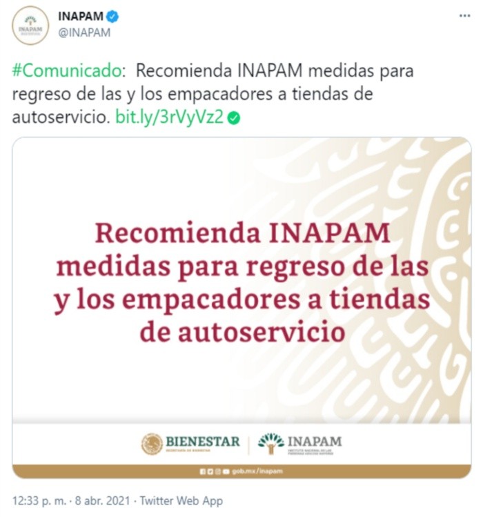 El Instituto Nacional de las Personas Adultas Mayores (Inapam) consideró que los empacadores de mercancías en supermercados, que hayan completado su esquema de vacunación COVID-19, pueden reiniciar sus actividades de manera voluntaria en las diferentes sucursales de tiendas de autoservicio con base en el semáforo de riesgo epidemiológico de cada entidad federativa.A través de un comunicado el instituto también llamó a esta población a aplicar las medidas sanitarias establecidas por la Secretaría de Salud federal."El Inapam, como órgano rector de la política pública hacia las personas adultas mayores, no encuentra objeción en el retorno de las actividades referidas, siempre y cuando sea de manera gradual y ordenada, con respeto al porcentaje de concentración de ciudadanos permitido de acuerdo al color del semáforo epidemiológico y de las características específicas de cada establecimiento", reitero el organismo.Ante ello, el Inapam recomendó la reincorporación de las personas adultas mayores a su actividad de empacado de mercancía, de manera paulatina, con aquellas que completaron su esquema de vacunación COVID-19 y que no hayan presentado alguna enfermedad respiratoria en el último mes.Además de atender el semáforo de riesgo epidemiológico conforme a lo establecido en cada entidad de la República, puesto que se debe recordar que este es un sistema de monitoreo para la regulación del uso del espacio público de acuerdo con el riesgo de contagio de COVID-19.Agregó que para aquellos que deseen voluntariamente permanecer en sus domicilios por un periodo más prolongado, se sugiere a las empresas proporcionarles las facilidades para reincorporarse al establecimiento donde realizaban la actividad de empacador de mercancía, en el momento que lo decidan o cuando la tienda opere al 100 por ciento.Así como aplicar el uso obligatorio de cubrebocas desde la salida de su domicilio, durante el tiempo que permanezcan en la tienda y de regreso a su casa."Será indispensable brindar capacitación a los empacadores voluntarios sobre las medidas preventivas implementadas por cada establecimiento, que deberán seguir durante su horario de actividad en la tienda y al llegar casa, entre las que se encuentran las prácticas apropiadas de higiene de manos, toser o estornudar de etiqueta y la sana distancia durante el desarrollo de actividades y el contacto social".El Inapam destacó la importancia de establecer un filtro sanitario al ingresar a la tienda como se hace con el resto de personal, con la finalidad de medir la temperatura, realizar limpieza de calzado en tapete sanitizante y aplicar alcohol gel en las manos.Proporcionar las condiciones sanitarias necesarias, tales como espacios y materiales requeridos para la continua higiene de manos, cubre boca, guantes desechables, caretas o los establecidos por el corporativo, para su protección."Se deberán evitar aglomeraciones en horarios de espera de cajas, manteniendo la permanencia de una sola persona para el servicio y privilegiando la sana distancia".Finalmente el instituto recomienda a las empresas mantener flexibilidad para permisos de ausencia por enfermedad, alentando a quedarse en casa a quienes muestren síntomas relacionados con enfermedades respiratorias, como fiebre, dolores musculares, de cabeza, garganta, tos, escurrimiento nasal y nariz obstruida, o estómago indispuesto."Reducir al mínimo las situaciones en las que se concentren grupos de personas mayores y cuando sea necesario reunirse, evitar el contacto estrecho manteniendo una separación mínima de 1.5 metros y asegurarse que haya ventilación apropiada o que se lleve a cabo en un lugar abierto", finalizó el Inapam.OF