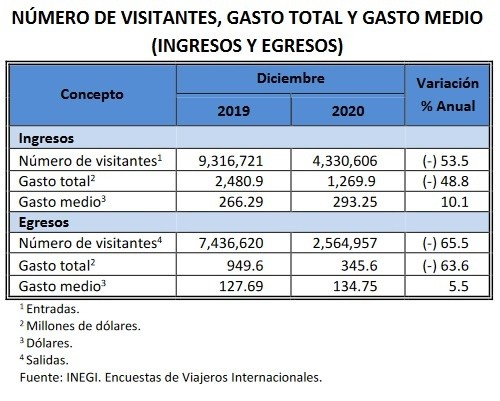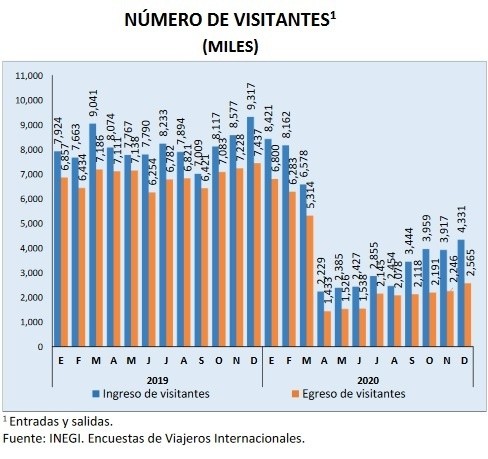 El Instituto Nacional de Estadística y Geografía (Inegi) detalló en un informe que México sufrió un desplome histórico del turismo internacional em 2020, el año que inició la pandemia por el COVID-19, tras estables máximos históricos durante siete años consectuvivos (2013-2019).El país captó 11 mil 25 millones de dólares (236 mil 962 millones de pesos) por el gasto que efectuaron los visitantes del exterior durante su desplazamiento y estancia en 2020, tratándose del menor ingreso de divisas turísticas de los últimos 16 años, desde 2004, cuando entraron 10 mil 796 millones de dólares, de acuerdo con los resultados de las Encuestas de Viajeros Internacionales que el Instituto dio a conocer este miércoles.La derrama económica de 2020 equivale a menos de la mitad (-55%) que lo obtenido en 2019 y significa la caída más profunda de los últimos 40 años al menos, pues desde que hay cifras disponibles, a partir de 1980, el turismo internacional no reportaba un colapso de tal magnitud.El desplome fue más profundo en comparación con los 11 mil 286 millones de dólares que esperaba la Secretaría de Turismo (Sectur).En particular, los turistas que suelen gastar más dinero son aquellos que se internan en avión, cuyo desembolso fue de ocho mil 301 millones de dólares y la gran mayoría llegó de Estados Unidos y Canadá.Cancún, Puerto Vallarta, Los Cabos y la Ciudad de México continuaron siendo los destinos favoritos de los norteamericanos en 2020.Los sondeos del Inegi revelan que el país recibió un total de 24 millones 316 mil turistas internacionales el año pasado, un derrumbe histórico de 46% con relación a 2019.Esta cifra también quedó por debajo de los 24 millones 825 mil turistas que pronosticó la dependencia que encabeza Miguel Torruco.A pesar del descalabro, la Sectur calcula que México pasaría del séptimo al tercer lugar mundial en llegada de turistas internacionales en 2020, superado únicamente por Italia y Francia.El secretario de Turismo, Miguel Torruco, reconoce que el turismo tuvo en 2020 su peor año desde la Segunda Guerra Mundial (1939-1945) y estima que, ni siquiera en el mejor de los escenarios, la llamada industria sin chimeneas logrará recuperarse durante 2021 de las pérdidas que le ocasionaron las restricciones por la pandemia.Para este año, prevé que, en un escenario conservador, México puede recibir 14 mil 400 millones de dólares por el gasto efectuado de viajeros internacionales, 41% menos que en 2019, antes de la pandemia. En cuanto a la cantidad de turistas extranjeros, proyecta la llegada de 30.4 millones y supone una disminución de 32% frente a 2019.Por su parte, el presidente del Consejo Nacional Empresarial Turístico (CNET), Braulio Arsuaga, advierte que 2021 puede terminar siendo "mucho peor" para el turismo que 2020, luego de que se anunció que los vuelos entre Canadá y México fueron suspendidos del 31 de enero al 30 de abril.GC