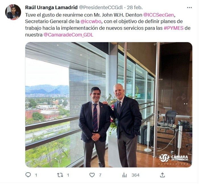 La Cámara Nacional de Comercio de Guadalajara (Canaco) será sede en México del Centro de Emprendimiento ICC junto con la International Chamber of Commerce México. El principal objetivo es asesorar, capacitar, impulsar y crear una red de conectividad entre los emprendedores mexicanos e internacionales.Entre otra de las misiones que tiene este centro es conectar a los emprendedores de nuestro país con la red de Centros de Emprendimiento de la ICC a nivel mundial. Hoy cuenta con una red de 11 emprendimientos en cuatro continentes.Fue formalizado el acuerdo para la próxima apertura del Centro de Emprendimiento ICC en la Cámara de Comercio, Servicios y Turismo de Guadalajara entre el secretario general de la International Chamber of Commerce (ICC), John W. H. Denton, y la International Chamber of Commerce (ICC México), con el presidente de la Canaco Raúl Uranga Lamadrid.Esta alianza se celebró durante la primera sesión del Consejo General del World Chambers Federation, en Bogotá, Colombia, a la que asistieron Cámaras de Comercio de más de 24 países; Uranga Lamadrid, es el único consejero representante de México.Además, se trabajó en tres iniciativas globales enfocadas en las MIPYMES:En estos temas, la Cámara de Comercio de Guadalajara trabajará activamente en dos grupos de trabajo: Digitilización, junto a la Cámara de Comercio de Stuttgart, Alemania; y en Sustentabilidad, junto a la Cámara de Comercio Argentina.JM