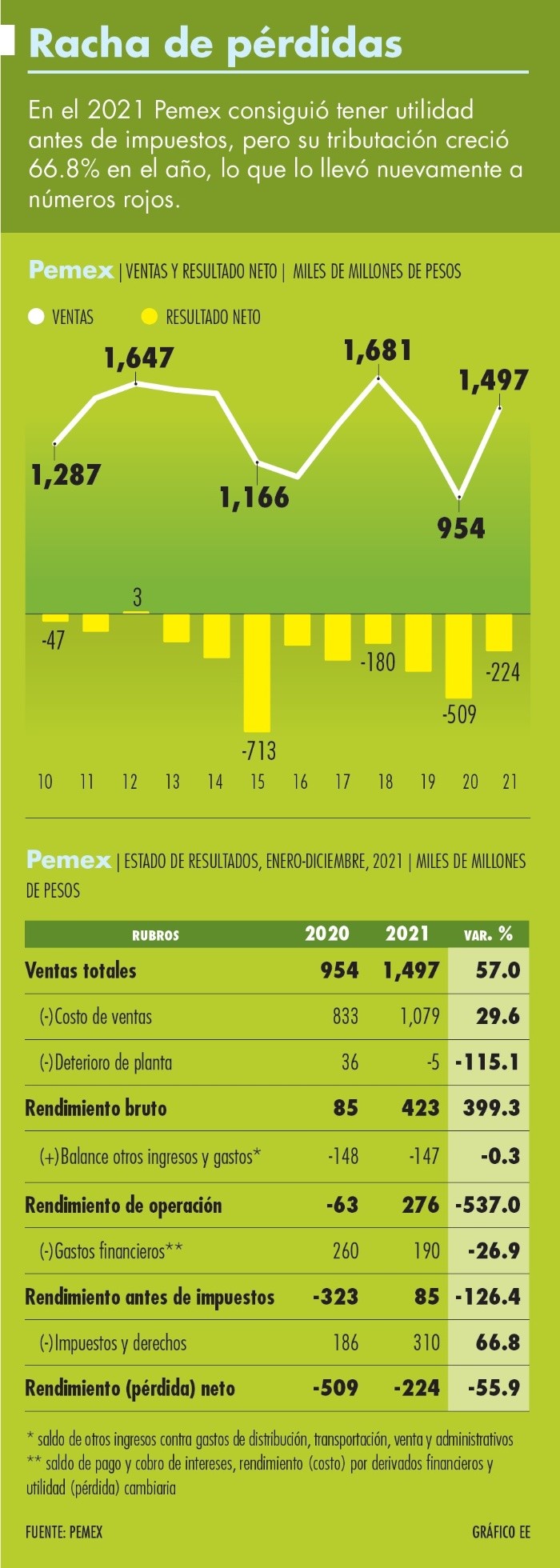 Petróleos Mexicanos (Pemex) tuvo una pérdida neta de 224 mil 363 millones de pesos durante el 2021, debido a su alto costo de ventas por los precios de los combustibles y pérdidas cambiarias, las obligaciones financieras que acumula y los impuestos que paga al fisco, además de un cuarto trimestre en que tuvo una pérdida neta de 124 mil 125 millones de pesos, en contraste con la utilidad que reportó en el mismo periodo del 2020, reportó la petrolera del Estado a inversionistas este lunes.En su informe a la Bolsa Mexicana de Valores, la estatal expuso que sus ingresos se incrementaron en 57% en comparación con los del año anterior, llegando a 1.496 billones de pesos, el monto más alto registrado desde el 2014 por las ventas de combustibles al interior y las exportaciones de crudo.Pero el costo de ventas en el que influye el gasto operativo y la volatilidad tanto de los precios de los combustibles como del peso frente al dólar para las exportaciones de crudo fue de 1.073 billones de pesos, con un incremento de 23% en relación con este renglón al cierre del 2020.De cualquier manera, en términos brutos Pemex registró una utilidad de 422 mil 832 millones de pesos, misma que prácticamente fue cinco veces superior a la que se reportó al cierre del año anterior. Pero entre gastos de venta y de administración, Pemex acumuló al finalizar el ejercicio un total de 163 mil 756 millones de pesos, monto que superó en 5 mil 426 millones de pesos a estos gastos reportados durante el 2020.En lo que respecta a la operación, Pemex cerró el año con una utilidad de 275 mil 584 millones de pesos, monto que muestra una gran mejoría en relación con la pérdida de 63 mil 063 millones de pesos del 2020. Y a diferencia del año anterior en que se registraron pérdidas antes de impuestos, en el ejercicio 2021 Pemex obtuvo una utilidad de 85 mil 243 millones de pesos antes de impuestos.Pero al incrementarse las exportaciones de crudo y su precio tanto por las referencias relacionadas con la oferta y la demanda global como por la apreciación del dólar frente al peso, los impuestos a la utilidad del año pasado sumaron 306 mil 606 millones de pesos, aumentando en 65% en comparación con el 2020 y acercándose a los niveles del 2019, en que se había alcanzado un pago de impuestos por 359 mil 799 millones de pesos.Así, los impuestos que pagó Pemex representaron el 20.5% de sus ingresos totales, aumentando en un punto porcentual en un año.Lo anterior, a pesar de que la empresa recibió apoyos por 275 mil 849 millones de pesos, de los cuales 73 mil 280 correspondieron al Estímulo fiscal anual acreditable al pago del Derecho por la Utilidad Compartida (DUC) y otros 275 mil 849 a aportaciones patrimoniales para el pago de las amortizaciones de la deuda.Producción y proceso de crudoLa producción de crudo de Pemex fue de 1.756 millones de barriles diarios, con lo que aumentó por segundo año consecutivo, con un incremento anual de 2.9 por ciento. De campos nuevos, Pemex añade ya una extracción de 122 mil barriles diarios a la producción nacional.La dirección de la empresa reiteró que se llegará a 2.063 millones de barriles diarios de crudo en 2024.Además, el proceso de crudo llegó a 740 mil barriles diarios al llegar al cuarto trimestre del año, con lo que la utilización de la infraestructura fue de 45.1 por ciento.Deuda y patrimonioEl pasivo total de la empresa sumó 4.206 billones de pesos reduciéndose en 3% en comparación con el monto que reportó al cierre del 2020. De éste, el pasivo laboral bajó 10% en un año, situándose en 1.384 billones de pesos.Los activos de la empresa cuantifican 2.105 billones de pesos, luego de que las condiciones permitieron un incremento contable de 9% en un año.Sin embargo, el patrimonio de Pemex se redujo en 13% en estas condiciones, con lo que al cierre del 2021 se sitúa en 2.1 billones de pesos.Pemex informó que redujo sus ingresos financieros a 29.376 millones de pesos, en contraste con los 69.860 millones solicitados el año anterior. Además, por renegociaciones de la deuda a mayor plazo disminuyó también sus gastos financieros por amortizaciones a la deuda, registrando un monto de 216 mil 607 millones de pesos durante 2021.