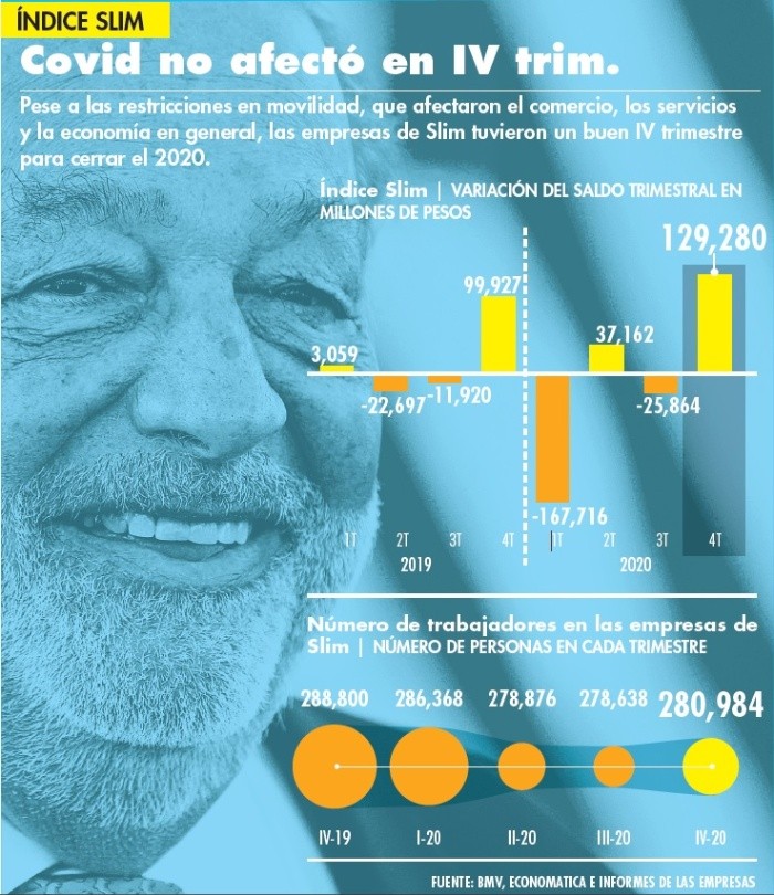 En el cuarto trimestre del 2020 la fortuna del magnate mexicano Carlos Slim registró un fuerte aumento, después de que en los nueve primeros meses del año sufrió cuantiosas pérdidas. El aumento respecto al tercer trimestre fue de 129 mil 280 millones de pesos, incremento que no se veía desde el cuarto trimestre del 2016. Sin embargo, en el acumulado en todo el 2020 el valor de su fortuna no logró sobreponerse a los retrocesos de los tres primeros trimestres y el repunte del cierre del año no alcanzó a borrar las perdidas, dejándole una disminución de 27 mil 138 millones de pesos.Algo importante a destacar es que en el cuarto trimestre del 2020, Grupo Carso contribuyó con la mayor parte del aumento en el valor de mercado de las empresas de magnate mexicano. La aportación fue de 47 mil 227 millones de pesos, superando la de América Móvil (AMX), que fue de 47 mil 106 millones de pesos, empresa que por su peso en el conglomerado es la que por lo general realiza la mayor aportación, aunque también algo importante a destacar fue que todas las empresas sumaron valor a la fortuna del hombre más rico de México.El ingreso por la venta de bienes y servicios en las empresas del magnate mexicano de 81 años, resistió la estrepitosa caída de la economía nacional. El 2020 es uno de los años que pasará a la historia con el peor desempeño en casi 90 años, sin embargo, pese a la drástica caída en prácticamente todos los sectores de la economía mexicana, el conjunto de empresas de Carlos Slim registró una baja de apenas 3.2% en los ingresos y un aumento de 67.2% en la utilidad neta en el cuarto trimestre del 2020, respecto al mismo trimestre de un año antes.Pese a representar solo 10% del valor de mercado de las empresas, Grupo Carso aportó el 37% del aumento en el valor de mercado del conglomerado de empresas. Si bien América Móvil representa poco más de dos terceras partes del valor de capitalización de las empresas de Slim, en el cuarto trimestre no pudo superar la aportación de Grupo Carso, ello se explica por que en el último trimestre del 2020 no registró paro de actividades en ninguna de sus divisiones de manufactura de cable y en la de autopartes, hecho que le permitió mantener su cuota de mercado e incrementar sus ventas.La operación y finanzas en las empresasDe acuerdo con informes de las empresas, a principios del cuarto trimestre del 2020 la recuperación económica ya estaba en marcha y parecía estar acelerándose en la mayor parte de la región de operaciones de las empresas del magnate mexicano, con niveles de confianza repuntando en noviembre después de realizarse las elecciones presidenciales de Estados Unidos y, poco después, los anuncios de aprobación de vacunas contra el virus COVID-19.En ese contexto, las monedas latinoamericanas, que se habían depreciado fuertemente frente al dólar estadounidense al inicio de la pandemia se fortalecieron notablemente, el peso mexicano, colombiano y chileno subiendo más o menos un 10% frente al dólar durante el trimestre y también se fortalecieron otras monedas, incluyendo el euro y el real brasileño, que se recuperaron 4.0% y 7.9%, respectivamente.La diferencia registrada entre los aumentos del valor nominal del peso y los de tipos de cambio constantes tuvieron que ver principalmente con que el peso mexicano se apreció frente a la mayoría de las monedas latinoamericanas, especialmente frente al real brasileño (22.9%), lo que disminuyó el valor en pesos de los ingresos denominados en reales brasileños, esto fue particularmente importante en el lado de América Móvil, dado que ello representó una importante ganancia por fluctuación cambiaria, al compensar el efecto de la depreciación del peso mexicano frente al dólar estadounidense en 6.2%, y el euro 13.0 por ciento.En el último trimestre del 2020, la recuperación en el empleo en las empresas de Carlos Slim, aunque fue de apenas 0.84% respecto al trimestre previo, muestra un aumento en los niveles de operación al cierre del año, pero la mejor noticia podría ser que en el 2021 se puede recuperar parte de lo perdido en el año de la pandemia y ya con vacunas aplicadas a la mayor parte de la población, la urgente necesidad de echar andar la planta productiva e incorporar a todas las actividades de servicios y sobre todo la fuerte tracción de la economía de Estados Unidos.