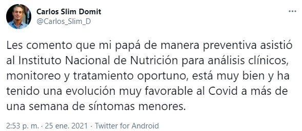 "Les comento que mi papá de manera preventiva asistió al Instituto Nacional de Nutrición para análisis clínicos, monitoreo y tratamiento oportuno, está muy bien y ha tenido una evolución muy favorable al Covid a más de una semana de síntomas menores", dijo Slim Domit en su cuenta de Twitter.