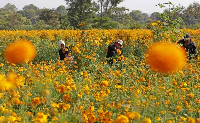 Plantada una vez al año y recolectada cuatro meses después, la flor de cempasúchil, de un brillante naranja, es un modo de vida para miles de pobladores del estado de Puebla y corona las ofrendas del Día de Muertos en México.Por su color y por su olor peculiar, el cempasúchil es un símbolo de las ofrendas para los muertos y ayudan a guiar las almas rumbo a estos festejos que llegan a su máxima expresión el 1 y 2 de noviembre.En el municipio de Atlixco, de unos 100 mil habitantes, el cultivo de esta flor se convierte en una prioridad durante la temporada, y dicha planta se distribuye luego a buena parte de México.Su nombre es de origen prehispánico se compone de los vocablos en náhuatl 'cempohualli', que quiere decir "veinte", y Xóchitl, que significa "flor".Del cempasúchil existen más de 30 variedades y colores. Sin embargo, para el uso que se le da en el mes de noviembre se utiliza la color naranja.Esta plantación solo se da una vez al año y tiene un periodo de cosecha y corta de cuatro meses, es decir, desde el mes de mayo inicia el preparado de la tierra y sección de la semilla, posteriormente se siembra, se fertiliza, fumiga y se riega, con la finalidad de tener la mejor cosecha.Con difícil acceso por los caminos rurales se puede llegar a los campos de cultivo, plagados de estas flores de aproximadamente de 50 centímetros de alto y de diversas formas.Los trabajadores comienzan las jornadas desde primera hora para lograr recolectar el mayor número de flores y así cumplir con los clientes que consumen su producto.Con machete en mano, música de fondo y bromas entre ellos hacen que las horas más amenas.Armando Lucas, tiene 17 años y creció presenciando la actividad que realizan sus padres, quienes tienen 20 años trabajando en la tradicional corta de flor año con año.Sus primeros años de vida fueron entre plantas, sol y jugando en las tierras de cultivo.Pasaron los años y ahora a su corta edad aprendió el oficio, para ayudar económicamente a su familia."Realizo la jornada igual que mis padres, a todos nos ayuda el dinero que ganamos en esta temporada, porque lo utilizamos para la comida y para los gastos de la escuela", refirió el joven.Recordó que desde niño le gusta el olor y el colorido de los campos de siembra, ya que jugaba entre las plantas a esconderse o intentar cortar la planta con las manos.Poco a poco, tomó la práctica para realizar esta labor tan importante para los mexicanos, ya que su trabajo estará presente en miles de altares para honrar a sus familiares fallecidos.Puebla se ha convertido en el mayor productor de cempasúchil debido a que alrededor de 50 municipios de los 217 con los que cuenta la región se dedica a la producción y cosecha anual, logrando que en las 32 entidades de México se pueda consumir este producto en las mejores condiciones.Se cuenta con una superficie de mil 705 hectáreas de cosecha, lo que se traduce en 15 mil 522 toneladas de flor recolectada en una quincena de municipios de la región.Ello representa el 21.43 % de la producción a nivel nacional y deja aproximadamente una derrama económica de más de 830 millones de pesos (43.5 millones de dólares).En entrevista, Modesta Delgado Juárez, productora de flor de cempasúchil, compartió que tiene 46 años dedicándose a esta actividad que, además de darle un sustento, le ayuda y la hace sentir bien porque "ayuda" a los difuntos a que visiten sus casas para recordarlos y honrados como si estuvieran en vida.Compartió que desde el 18 de octubre el producto tiene que estar listo para que los comerciantes lo comiencen a trasladar a su lugar de origen. El volumen de negocio es tal que en esos días se hacen contrataciones temporales, con la finalidad de agilizar los procesos."Vienen a Atlixco a hacer mercado con nuestra flor, ya que esta flor es en la única temporada en la que se da. Todo el año hay de todas las flores como la rosa o la gladiola u otra. Pero esta solo es en la temporada de Día de Muertos", indicó la mujer.Expresó que sus compradores vienen de los estados de Veracruz, Oaxaca, Guerrero, Morelos, la Ciudad de México, Toluca, Hidalgo, Tamaulipas y Zacatecas, entre otros.Hizo referencia de que esta flor es la que se pone en las ofrendas para invitar a entrar a las casa a los seres queridos que ya murieron.Explicó que según marca la tradición el día 28 octubre llegan las almas de las personas que perdieron la vida en accidente o muerte repentina, los días 30 y 31 de octubre llegan las almas de las niñas y niños, así como el día 1 de noviembre llegan las almas adultas y el 2 de noviembre se realizan las bendiciones y entrega de ofrendas en el panteón.IM