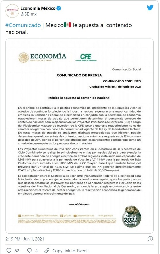 La Comisión Federal de Electricidad (CFE) y la Secretaría de Economía determinaron que los Proyectos Prioritarios de Inversión (PPI) deberán de tener un contenido nacional mínimo de 12%, con un deseable de 25 por ciento.Asimismo, en un proceso de contratación, el criterio de desempate que se utilizará será el porcentaje de contenido nacional que ofrezcan los concursantes.Este porcentaje aplica para los Proyectos Prioritarios de Inversión "consistentes en el desarrollo de seis centrales de Ciclo Combinado se realizarán principalmente en las penínsulas del país" que en total suman los 4 mil 345 megawatts.En la península de Yucatán se instalará una capacidad de mil 545 megawatts y para la península de Baja California mil 714 megawatts. Así como los mil 086 megawatts de la Central de Ciclo Combinado de Tuxpan Fase I."Se estima que los PPI generen aproximadamente 17 mil 475 empleos directos y 12 mil 890 indirectos, con un total de 30 mil 365 empleos", dijeron ambas instancias de gobierno en un comunicado.Tras diversas peticiones del sector privado mexicano, la CFE y la Secretaría de Economía establecieron mesas de trabajo para determinar el porcentaje correcto de contenido nacional para la ejecución de los Proyectos Prioritarios de Inversión a cargo del Fideicomiso Maestro de Inversión de la CFE.JM