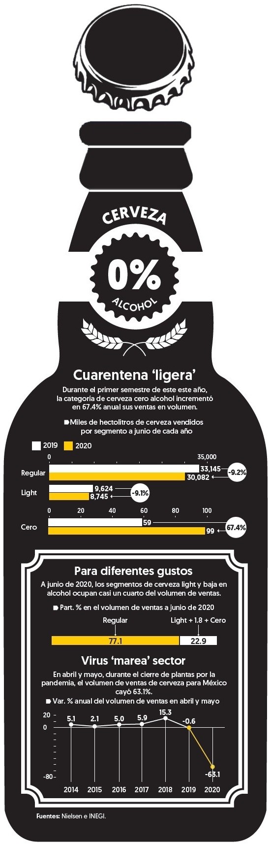 Durante el primer semestre de este este año, la categoría de cero alcohol aumentó 67.4 por ciento anual sus ventas en volumen, mientras que la bebida tradicional y las light cayeron 9.2 y 9.1 por ciento respectivamente, frente al mismo periodo de 2019, revelan datos de Nielsen.