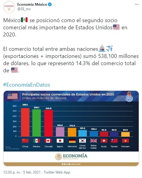 Aunque en los primeros meses de la pandemia China redujo sus exportaciones, logró cerrar el 2020 como primer socio comercial de Estados Unidos, mientras que México quedó en segundo sitio.La Oficina del Censo estadounidense dio a conocer que de enero a diciembre de 2020 las importaciones y exportaciones entre China y Estados Unidos alcanzaron los 560 mil millones de dólares, es decir, 14.9% del intercambio total estadounidense.Entre México y Estados Unidos el comercio sumó 538 mil millones de dólares, es decir, el 14.3% del total del comercio estadounidense. De ese total 325 mil 394 millones de dólares fueron exportaciones de productos mexicanos y 212 mil 671 millones de dólares importaciones.Durante algunos meses, justo cuando China redujo más sus exportaciones, México logró ser el principal socio de Estados Unidos, sin embargo al finalizar el año los chinos lograron recuperar terreno.Al respecto, la Secretaría de Economía resaltó en un tuit que México se posicionó como el segundo socio comercial estadounidense en 2020.La Subsecretaria de Comercio Exterior de la Secretaría de Economía, Luz María de la Mora escribió en su cuenta de Twitter: "En 2020 el intercambio comercial entre México y Estados Unidos ascendió a 538.1 mil millones de dólares, lo que representa 14.3% del comercio total de Estados Unidos con el mundo y nos coloca como su segundo socio comercial, de acuerdo con datos de @uscensusbureau".NR