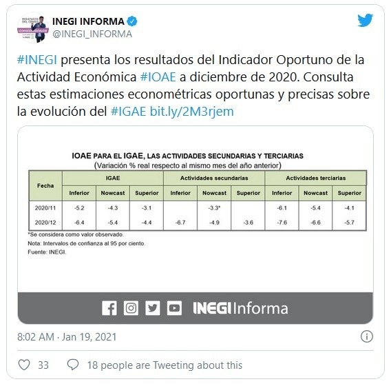 El endurecimiento de medidas preventivas para contener los contagios de coronavirus al cierre de 2020, las cuales contemplaron el cierre de comercios en varias entidades del país, frenó la recuperación que se venía registrando desde mediados del 2020, revelan las estimaciones preliminares del Inegi.El Indicador Oportuno de la Actividad Económica (IOAE), que estima anticipadamente variaciones del Indicador Global de Actividad Económica (IGAE, una especie de PIB mensual), prevé una contracción de 5.4% para diciembre de 2020 contra diciembre de 2019, caída anual superior a la reportada un mes antes.La disminución de actividades económicas en diciembre pasado frenó la tendencia de menores caídas anuales que venía registrando este indicador desde junio de 2020. Esta recuperación se ve reflejada en las variaciones positivas mensuales que registró el IGAE desde mediados del año pasado hasta octubre.Con base en las estimaciones puntuales del Inegi, se estima que la variación de la actividad económica pasó de un crecimiento mensual de 0.4% en noviembre a una contracción estimada de 1.3% en diciembre de 2020, la primera caída mensual desde mayo pasado.Considerando los principales grandes sectores de actividad del IGAE, se tiene que para las actividades industriales se calcula una caída anual de 4.9% en diciembre, tasa superior al -3.3% reportado en noviembre, mientras que para el sector terciario relacionado con los servicios prevén una variación anual de -6.6%, caída superior al -5.4% estimado para noviembre.JM