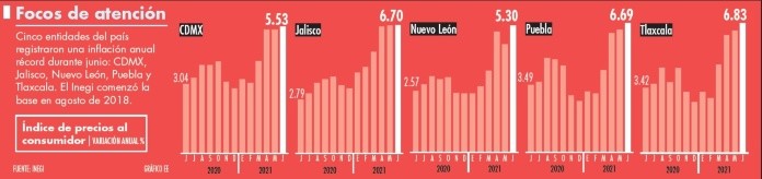 Durante junio de este año, cinco entidades del país registraron cifras récord en su nivel de inflación anual: Ciudad de México, Nuevo León, Jalisco, Puebla y Tlaxcala.El relajamiento en las restricciones sanitarias para los sectores económicos y la movilidad, el aumento de los costos del gas doméstico LP, la sequía que impactó en los insumos y las interrupciones en las cadenas de proveeduría fueron algunos factores que impulsaron la demanda y por ende, aceleraron los precios.De acuerdo con datos del Inegi, la Ciudad de México, principal motor económico del país con una aportación de 16.0% del Producto Interno Bruto (PIB), observó un incremento en su índice de precios al consumidor de 5.53% a tasa anual en el sexto mes del 2021.Para la capital, fue la mayor inflación presentada desde que se tienen registros (el Inegi comenzó la base estadística por estado de este indicador en agosto del 2018). Los productos genéricos con las variaciones anuales más elevadas en sus precios fueron transporte aéreo (33.31%); gas doméstico LP (31.55%); limón (26.26%); jitomate (24.22%); colchas y cobijas (23.84%); relojes, joyas y bisutería (21.69%), y gasolina de alto octanaje (21.37 por ciento).Al otro extremo, las caídas más pronunciadas se dieron en chile serrano (-29.55%), cebolla (-19.17%) y lámparas (-16.65 por ciento).En Nuevo León, que es la tercera economía más grande de México con 8.0% del PIB nacional, la inflación anual fue de 5.30% en junio. Los mayores aumentos en los precios de productos y servicios se observaron en transporte aéreo (51.85%), gas doméstico LP (39.98%), pepino (25.74%), limón (25.17%) y gasolina de alto octanaje (24.03%); las mayores bajas fueron en chile serrano (-40.97%), medicamentos para alergias (-18.08%) y zanahoria (-16.71 por ciento).Por su parte, Jalisco, con una contribución al PIB de 7.2% (cuarto lugar), exhibió un ascenso anual de 6.70% en los precios al consumidor, donde las mayores alzas fueron en gas doméstico LP (35.56%), ropa interior para hombre (32.71%), limón (29.53%), pollo (28.92%) y chile seco (27.21%); los desplomes más pronunciados fueron en chile serrano (-31.77%), cebolla (-23.33%) y medicamentos para diabetes (-12.25 por ciento).Puebla, en la posición 11 del PIB (3.3%), llegó a su nivel inflacionario récord con una tasa de 6.69 por ciento. En la parte alta de crecimiento en los precios de los productos genéricos se colocaron derechos por el suministro de agua (406.37%), transporte aéreo (39.80%), gas doméstico (36.94%), jitomate (30.70%), chayote (30.63%), aceites y grasas vegetables comestibles (26.27%) y gasolina de alto octanaje (25.06%); las mayores reducciones fueron en otros chiles frescos (-17.71%), chile serrano (-16.07%) y enseñanza adicional (-17.71 por ciento).Por último, Tlaxcala, la economía más pequeña de México con apenas 0.6% del PIB, alcanzó su máximo en inflación con una variación de 6.83 por ciento. Las tasas más elevadas se mostraron en transporte aéreo (43.29%), gas doméstico LP (38.98%), jitomate (34.30%), chayote (28.89%), plantas y flores (26.42%) y gasolina de alto octanaje (22.95%); en el otro polo se ubicaron cebolla (-17.91%), material de curación (-15.71%) y arroz (-13.71 por ciento).Lo anterior coincide con los resultados del Índice Nacional de Precios al Consumidor. De la inflación anual en junio de 5.88%, los componentes con mayor incidencia, que se refiere a la contribución en puntos porcentuales de cada uno de éstos al indicador general y se calcula utilizando los ponderadores de cada subíndice, fueron energéticos (1.539 puntos); alimentos, bebidas y tabaco (1.237); mercancías no alimenticias (1.078), y otros servicios (0.819). Este último incluye loncherías, fondas y taquerías, restaurantes y similares, servicio de telefonía móvil, mantenimiento de automóvil, consulta médica, servicios turísticos en paquete, entre otros.Por entidad, los mayores incrementos anuales en los precios al consumidor durante junio se registraron en Zacatecas (7.74% anual), Coahuila (6.93%) y Baja California (6.84%), mientras las tasas más bajas fueron en Morelos (5.07%), Quintana Roo (4.40%) y Tabasco (3.85 por ciento).Con estos resultados se observa que 31 de las 32 entidades del país (excepto Tabasco) se encuentran por arriba del objetivo.