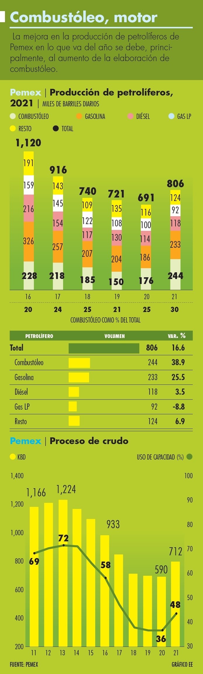 En materia de refinación, Petróleos Mexicanos (Pemex) tuvo un 2021 agridulce. La estatal consiguió elevar por primera vez desde el 2013 su proceso de crudo pero, en un hecho inédito, el combustóleo se convirtió en el primer producto elaborado en el sistema de refinación de la estatal, superando a la gasolina y el diésel, los carburantes de mayor valor.El año pasado el volumen de petróleo crudo procesado en el sistema de seis refinerías de Pemex creció 20.6% a 712 mil barriles diarios, equivalente a 121 mil barriles más, que le permitieron a la estatal elevar su porcentaje de uso de capacidad refinadora a 43.4%, desde el piso histórico de 36% del 2021, de acuerdo con datos de la base de datos institucional de la empresa. Pemex rompió así una racha de siete años de caídas en proceso de crudo, que le significaron una caída acumulada de 57% en el 2020 desde su último pico, de un millón 224 mil barriles de crudo procesado en el 2013, año en el que el uso de capacidad refinadora llegó a 72.4 por ciento.La mejora en el volumen de proceso de crudo permitió que la producción de petrolíferos repuntara 16.6% a 806 mil toneles diarios, siendo el combustóleo el producto de mayor abundancia, con 244 mil barriles diarios.Esta cifra fue 38.9% superior a la del 2020 y alcanzó una cuota de 30.3% del total de refinados elaborados por la estatal.Le siguieron la gasolina, cuyo volumen de producción creció 25.5% a 233 mil barriles diarios; y el diésel, que creció 3.5% a 118 mil barriles diarios. La elaboración de gas licuado de petróleo (LP) cayó 8.8% a 92, mil barriles diarios, un mínimo de al menos dos décadas.Este aumento en la disponibilidad de combustóleo se da en un contexto en el que el gobierno mexicano presentó una iniciativa de reforma constitucional en materia eléctrica que prevé devolver a la Comisión Federal de Electricidad (CFE) el monopolio en la comercialización de energía eléctrica y limitar la participación privada en el mercado de generación.Lo anterior dejaría por entero la responsabilidad a la CFE de organizar la oferta eléctrica nacional y establecer un tope de 46% de la electricidad total a la generación de privados – que producen principalmente con gas natural y fuentes renovables.Debido a esto, la estatal podría verse obligada a elevar la utilización de sus plantas de generación fósil que hoy no despachan por producir energía eléctrica cara. Varias de estas utilizan combustóleo, que es una de las fuentes fósiles para generación eléctrica más sucias junto con el carbón y el diésel.Además de elevar la comercialización del combustóleo en territorio mexicano –en donde la CFE es prácticamente el único comprador– Pemex también tiene la alternativa de exportar el combustible para que sea reprocesado y puedan producirse más refinados a partir de él en refinerías con una mejor tecnología, como las del sur de Texas.Plantes ambiciososEstas cifras se dan en medio de la ejecución de planes de la presente administración para reflotar la producción de refinados de Pemex, tras casi una década de baja inversión en mantenimiento en la planta de proceso, a medida que el enfoque de la administración pasada se decantó por la comercialización más que por la producción de refinados.Se trata también del punto de partida de un ambicioso plan de negocios de Pemex, en el cual proyecta elevar nada menos que en 68% su volumen de crudo procesado, para alcanzar un millón 200 mil barriles diarios en el 2022, lo cual implicaría llevar el uso de capacidad a 73.2 por ciento.Lo anterior iría de la mano de una reducción de casi 60% en la exportación de petróleo crudo de la empresa, pues la esencia de la nueva estrategia de negocios es enfocarse en el procesamiento doméstico del aceite para abastecer el mercado interno, según se desprende de los planes hechos públicos por su director Octavio Romero Oropeza los últimos días de diciembre del 2021.La meta última de la empresa es dejar completamente el negocio de la exportación en el 2023, con lo que procesaría ella misma toda su producción de aceite.En ese año pretende procesar un millón 308 mil toneles diarios en las seis refinerías que posee actualmente, más 340 mil barriles en la nueva refinería de Dos Bocas y 323 mil barriles más en la recién adquirida refinería Deer Park, en Texas.