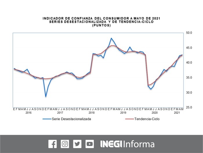 La percepción de las familias sobre su situación económica y del país registró un avance marginal durante el mes pasado, revelaron los resultados de la Encuesta Nacional de Confianza del Consumidor publicados esta mañana por el Instituto Nacional de Estadística y Geografía (Inegi) y Banco de México (Banxico).En mayo de 2021, el Indicador de Confianza del Consumidor se situó en 42.7 puntos, nivel que implicó un aumento mensual de 0.3 puntos, el incremento más bajo desde junio de 2020, con excepción de febrero de este año y noviembre del año pasado en que se reportaron retrocesos.Tres de los cinco componentes que integran dicho indicador reportaron un alza mensual en mayo. Por ejemplo, el componente que evalúa la opinión sobre la situación económica de los integrantes del hogar en el momento actual frente a la que tenían hace doce meses se redujo 0.3 puntos con relación al nivel del mes previo.En tanto que el rubro correspondiente a la expectativa sobre la situación económica de los miembros del hogar dentro de doce meses respecto a la que registran en el momento actual creció 1.1 puntos.La variable que mide la percepción de los consumidores acerca de la situación económica del país hoy en día comparada con la que prevaleció hace doce meses reportó el mayor crecimiento con un avance de 1.4 puntos. El indicador que capta las expectativas sobre la condición económica del país esperada dentro de un año respecto a la situación actual mostró un alza de 0.7 puntos.Por su parte, el componente relativo a la opinión sobre las posibilidades en el momento actual por parte de los integrantes del hogar, comparadas con las de hace un año, para efectuar compras de bienes durables, tales como muebles, televisor, lavadora y otros aparatos electrodomésticos registró una disminución de 1.7 puntos.Asimismo, el Inegi y el Banxico presentaron las series complementarias sobre la confianza del consumidor y que se refieren a las posibilidades de comprar ropa, zapatos, alimentos, salir de vacaciones y ahorrar, entre otros.Entre los indicadores que reportaron la mayor alza, destaca la percepción sobre la situación del empleo en el país en los próximos 12 meses con un incremento de 1.1 unidades.Por el contrario, el rubro que registró el mayor retroceso fue el relacionado con las posibilidades económicas para salir de vacaciones de los miembros del hogar durante los próximos 12 meses.NR