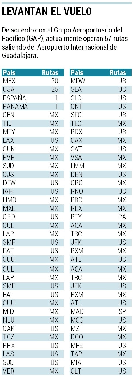 En mayo pasado, la aerolínea Frontier inauguró el vuelo Guadalajara-Las Vegas. Esta nueva ruta forma parte de las 57 que ya operan y que salen desde el Aeropuerto Internacional de Guadalajara.Durante enero a julio pasados destacó también la apertura de la ruta Guadalajara-Toluca de parte de la aerolínea Volaris, la cual sigue creciendo sus operaciones en el aeropuerto local.La terminal tapatía poco a poco recupera su conectividad aérea que tenía tanto en destinos nacionales como internacionales antes de la crisis sanitaria provocada por el COVID-19.Antes de la pandemia, la terminal tapatía tenía un poco más de 60 rutas, pero se espera que este año recupere casi todas.“Ahorita tenemos casi la totalidad de las rutas. Sí nos faltan cinco o seis que iniciaron, que eran rutas nuevas y que se deben consolidar, pero desgraciadamente por el tema de la contingencia sanitaria no terminaron de consolidarse y las retiraron, pero está en la mira de las propias compañías la recuperación de esas rutas puntuales, que eran nacionales y alguna internacional”, explicó Martín Pablo Zazueta, administrador del Aeropuerto Internacional de Guadalajara.Detalló que entre las rutas que faltan por recuperar se encuentran algunas nacionales y la de Alburquerque, en Nuevo México.Y se busca muy pronto concretar una ruta Guadalajara con alguna ciudad de Canadá.“Las rutas que teníamos tanto nacionales como internacionales han tenido una recuperación importante, incluso con los números superiores a los que teníamos en el año 2019”, afirmó.Otras rutas nuevas, como la de Guadalajara-Madrid, que inició el año pasado, ya tiene tres frecuencias a la semana y se espera que tenga una frecuencia diaria.La ruta Guadalajara-París se sigue analizando y no se descarta que se pueda concretar en un futuro.“Las rutas internacionales llevan un tiempo en su maduración para que se puedan aperturar, ahorita estamos trabajando con algunas posibilidades para Canadá. No nos cerramos a la posibilidad de tener otra ruta a Europa”, aclaró. El directivo explicó que, de acuerdo con estudios internacionales, el aeropuerto tapatío forma parte de un primer grupo de terminales aéreas en el mundo que más pronto recuperarían su tráfico de pasajeros, debido a que se trata de una terminal de pasajeros metropolitana y regional, con un volumen de pasajeros importante.“Guadalajara era uno de éstos y estamos cumpliendo esa expectativa. Hay otros aeropuertos que se han recuperado más rápido, pero Guadalajara, al ser un aeropuerto metropolitano, está cumpliendo esa meta y lo vamos a hacer en los tres años que comentamos al inicio de la contingencia”.Sobre el tráfico de pasajeros en el Aeropuerto Internacional de Guadalajara se prevé superar los 15 millones de usuarios.De acuerdo con el Grupo Aeroportuario del Pacífico, entre enero y agosto de este año, en la terminal tapatía se movilizaron a más de 9.9 millones de pasajeros, lo que representa un 0.7% por arriba de los movilizados en 2019.El tráfico de pasajeros en el Aeropuerto Internacional de Guadalajara ya se recuperó y casi alcanzó los niveles que tenía previo a la pandemia de 2020.De acuerdo con el Grupo Aeroportuario del Pacífico (GAP), la empresa que administra el aeropuerto tapatío, de enero a julio se registró un alza de 31.8 por ciento en el tráfico de pasajeros, en comparación con el mismo periodo del año pasado.Según el reporte de la compañía enviado a la Bolsa Mexicana de Valores, en los primeros ocho meses del año ya se movilizaron 9.9 millones de pasajeros.“El tráfico prácticamente nos está situando en los niveles que teníamos en 2019, que es el año con el que tenemos que compararnos porque fue el año de mayor tráfico históricamente en Guadalajara”. “Si lo ves mes contra mes, julio de este año fue superior al de 2019. Quiere decir que la recuperación va en marcha, estamos un 4 por ciento arriba de 2019 y en el acumulado estamos prácticamente planos.“Para el cierre del año, la expectativa de la empresa es movilizar a más de 15 millones de pasajeros en el aeropuerto de Guadalajara. En 2019 movilizaron a 14 millones 980 mil pasajeros. “Todo dependerá del cumplimiento de la proyección del tráfico. Y todo apunta que eso será así porque tuvimos un buen verano”.Sobre el Grupo Aeroportuario del Pacífico, los resultados de los 12 aeropuertos que administra la empresa, entre ellos Guadalajara, Puerto Vallarta y Tijuana, indican que en el periodo de enero y julio se reportó un alza de 40.5 por ciento, al movilizar a 32 millones 046 mil pasajeros, contra los 22 millones 811 mil usuarios que se movieron el año pasado.La aerolínea Aeroméxico anunció que continúa con el plan estratégico establecido para conectar al Aeropuerto Internacional Felipe Ángeles (AIFA) con otras terminales del país, como la de Guadalajara.Para agosto, este avance representó un incremento del 100 por ciento en la oferta de destinos en dicho aeropuerto, comparado con lo operado desde marzo de este año.En un comunicado, la empresa dijo que para responder a las necesidades de los clientes y del negocio, la aerolínea operará seis rutas desde el AIFA, con una oferta total de 112 llegadas y salidas, que representan más de 10 mil asientos semanales“La estrategia de la flota de Aeroméxico hace posible que estos destinos ofrecidos desde y hacia el AIFA, sean adicionales a lo ya operado desde el Aeropuerto Internacional de la Ciudad de México (AICM)”, dijo la compañía. Por otra parte, Aeroméxico anunció a partir de la temporada de invierno un incremento de frecuencias en su ruta Guadalajara-Madrid y Monterrey-Madrid.La compañía aérea explicó que este incremento se debe a la demanda positiva que han tenido estos destinos desde que fueron lanzados en el 2021.La compañía explicó que pasará de tres a cinco sus frecuencias semanales a Madrid, saliendo desde Guadalajara.PARA SABERComo parte de las acciones de r