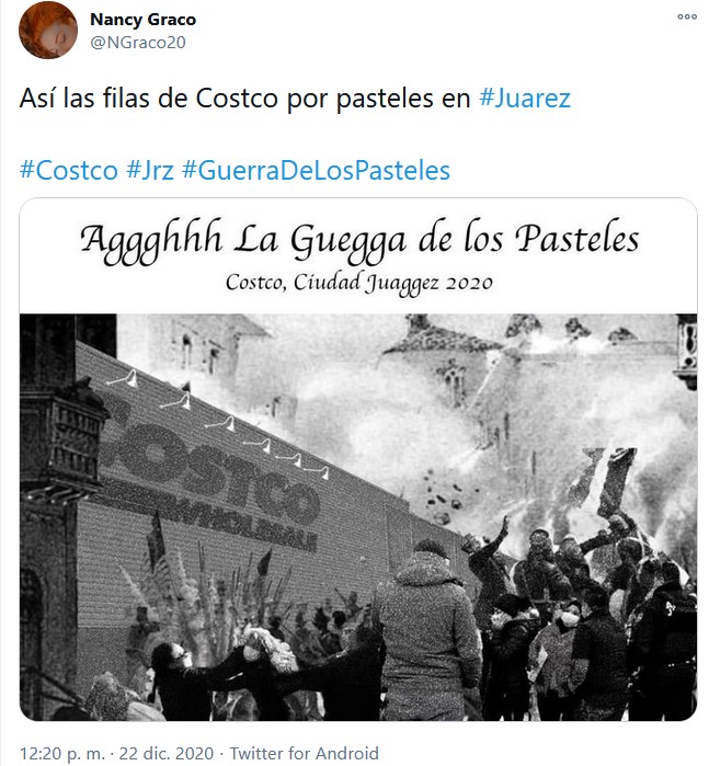 Una inusual disputa entre compradores en una tienda de la cadena Costco en Ciudad Juárez, Chihuahua, se volvió viral en redes sociales, donde la llamaron "guerra de los pasteles".Diarios locales reportaron que un grupo de clientes de la tienda de membresía se congregaron esta mañana en los accesos para protestar por el límite de compra de dos pasteles o piezas de repostería por persona. Muchos de esos clientes se dedican a revender el producto, por lo que, acompañados de un abogado, demandaban quitar la restricción.Pero entre algunas personas inconformes afuera de la tienda y otras que salían con varios pasteles se desataron reclamos que llegaron a los empujones; una mujer se cayó. Elementos de la policía municipal, que ya estaban en la zona, tuvieron que intervenir para separar a unas mujeres, según se observa en un video de El Diario de Juárez.En Twitter se volvió tendencia Costco y pronto comenzaron a surgir memes de la "guerra de los pasteles".Finalmente, el representante de los inconformes dio a conocer que la tienda acordó vender hasta cinco pasteles por socio y no limitar las visitas de los clientes por día.IM