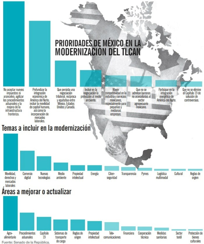 La quinta ronda para la modernización del Tratado de Libre Comercio para América del Norte (TLCAN) se desinfló luego de que los responsables de los equipos negociadores de México, Estados Unidos y Canadá anunciaron que no asistirán a este encuentro a realizarse oficialmente a partir de mañana.La canciller de Canadá, Chrystia Freeland, el representante comercial estadounidense, Robert Lighthizer, y el secretario de Economía de México, Ildefonso Guajardo, informaron que ante sus marcadas diferencias en la renegociación del TLCAN, acordaron un cambio de estrategia consistente en dejar que sus equipos avancen “tanto como sea posible” en los temas puestos sobre la mesa en la ronda anterior.A pesar de este escenario, Guajardo dijo que México presentará en esta ronda la propuesta de evaluar la continuidad del pacto comercial cada cinco años siempre y cuando se mantenga vigente, lo que representa un matiz a la cláusula de terminación anticipada, presentada en la ronda anterior por Estados Unidos, y que significa, en “automático, una muerte súbita” del acuerdo.LEA TAMBIÉN: México aceptaría analizar TLCAN cada cinco años: GuajardoEl relanzamiento del Tratado de Libre Comercio para América del Norte (TLCAN) podría lograr que la región se convierta en la más competitiva de este siglo. Este es el análisis del secretario de Relaciones Exteriores de México, Luis Videgaray, expresado en un contexto de desencuentro entre los encargados de los equipos negociadores.Tan es así que el secretario de Economía, Ildefonso Guajardo, insistió en que México debe estar listo para todos los escenarios en la renegociación del TLCAN, incluida la posibilidad de que no haya acuerdo.No obstante, México, Estados Unidos y Canadá, socios en el pacto comercial, comenzaron ayer la quinta ronda de pláticas, aunque iniciarán formalmente mañana y concluirán el martes.El distanciamiento es tal que la oficina del representante comercial de Estados Unidos dijo que 30 grupos de negociadores de menor nivel asistirán a los encuentros de esta semana en la Ciudad de México.Las negociaciones se han estancado debido a las severas exigencias de Estados Unidos, que incluyen un mayor contenido estadounidense en la manufactura de automóviles, cambios en el proceso de resolución de disputas y una cláusula que podría obligar a que el pacto se renueve cada cinco años.Los bajos salarios en México también han generado exigencias de Canadá de que se implementen mejores protecciones laborales.Sin embargo, México espera que en este encuentro se consiga avanzar en puntos donde existen coincidencias, como la mejora de prácticas regulatorias, el capítulo de telecomunicaciones y el combate contra la corrupción.La calificadora Standard and Poor´s dijo que ante un escenario de eventual término del TLCAN las empresas mexicanas y el sector financiero en el país tienen los elementos para soportar el impacto.Según la agencia, si bien su escenario central es que México, Estados Unidos y Canadá alcancen un acuerdo al final de las negociaciones, considera que la incertidumbre sobre el TLCAN probablemente genere volatilidad sobre la economía mexicana.El Fondo Monetario Internacional (FMI) advirtió el lunes que la incertidumbre sobre el futuro del acuerdo comercial es el principal riesgo para el crecimiento de México.Los mexicanos desean que el tema de la movilidad de los mercados laborales y el estrechamiento de la brecha salarial entre los tres países socios del Tratado de Libre Comercio para América del Norte (TLCAN) se incluyan dentro de las negociaciones para la modernización del acuerdo comercial que tiene como socios a México, Estados Unidos y Canadá.Una consulta nacional realizada por el Senado de la República, abierta a los ciudadanos en los meses de junio y julio de este año, muestra que el comercio digital y las nuevas tecnologías son aspectos que deberían considerarse también en las mesas de negociación.Entre las primeras prioridades a ser consideradas por los negociadores, los participantes en la consulta agregaron la protección del medio ambiente.El documento que agrupa los resultados de la consulta muestra que la propiedad intelectual, la ciberseguridad y las disposiciones de transparencia que inhiban la corrupción son temas que se han posicionado en el ánimo de los mexicanos ante la posibilidad de una mejora de un tratado comercial cuyas reglas de operación se fijaron hace más de 20 años.En la consulta, que constó de cinco preguntas (¿Cuáles deben ser las prioridades de México en la modernización del TLCAN? ¿Qué temas que no estén incluidos en el texto original del TLCAN deben ser integrados al mismo? ¿Qué áreas del TLCAN deben ser mejoradas o actualizadas? ¿Qué sectores de la economía deben contar con mayores apoyos de parte del Gobierno ante la modernización del TLCAN? ¿Cómo debe abordarse la movilidad laboral, los salarios y la protección al medio ambiente en la negociación?) muestra que para los mexicanos las cinco áreas prioritarias que requieren un ajuste o modernización dentro del TLCAN son el sector alimentario, los procedimientos aduanales, el sistema de transporte de carga, el Capítulo 19 -relativo a la solución de controversias-, y la protección a la propiedad intelectual y los derechos de autor.