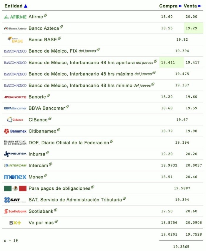 Este viernes, el dólar estadounidense promedia en 19 pesos con 68 centavos a la venta y en 18 pesos con 54 centavos a la compra en los bancos.La divisa norteamericana se ofrece en un máximo de 19.86 pesos y un mínimo de 19.59 pesos, y se adquiere en un precio máximo de 18.75 y un mínimo de 18.20 pesos.A su vez, el euro se vende hoy en 20.14 pesos en promedio y se compra en 19.07 pesos en promedio.De acuerdo con el Banco de México (Banxico), el tipo de cambio es de 19.39 pesos por cada dólar.Las Tasas de Interés Interbancarias de Equilibrio a plazos de 28 y 91 días son de 9.65% y 10.22%, respectivamente mientras que la Tasa de Interés Interbancaria de Equilibrio de fondeo es de 9.24%.El jueves, el Banxico subió ayer su tasa de referencia en 75 puntos base por cuarta vez consecutiva, para dejarla en 10%, el nivel más alto para el costo del crédito, el cual se registra en medio de la mayor inflación de los últimos años. -vll