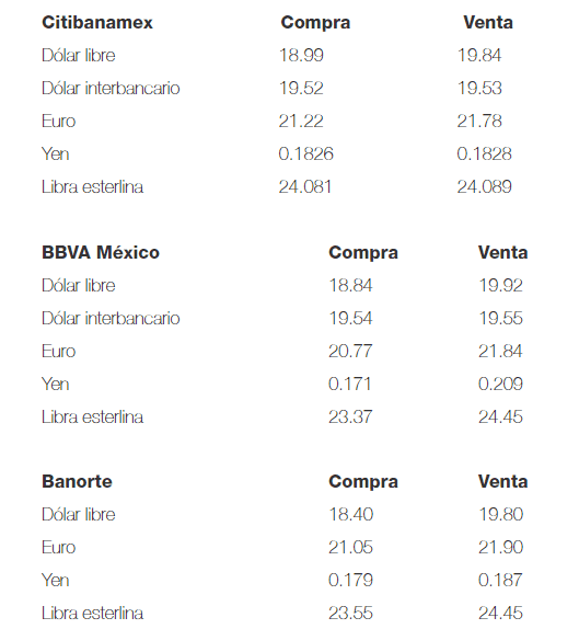 Este lunes, el dólar libre inicia la sesión cambiaria en un precio máximo de 19.92 pesos, sin cambios respecto al cierre del viernes, y se compra en un mínimo de 18.40 pesos en bancos de la Ciudad de México.En opinión de Banco Base, los participantes del mercado están cautelosos a la espera de eventos relevantes durante la semana.Señala que de acuerdo a medios, existe una menor disposición por parte de oficiales de China para alcanzar un acuerdo comercial con Estados Unidos, lo que reduce el optimismo con respecto a las reuniones que se llevarán a cabo a partir del próximo 10 de octubre.La institución financiera indica que al inicio de la semana, la mayoría de las divisas pierden terreno frente al dólar, en particular las de economías emergentes como la lira turca.Sin embargo, la cautela no se ha convertido en aversión al riesgo, pues los mercados de capitales en Europa muestran ganancias moderadas, mientras que no se observa una mayor demanda por activos libres de riesgo.La semana que inicia será clave para la política monetaria de Estados Unidos y México.El mercado especula que la Reserva Federal (Fed) podría volver a recortar su tasa de interés antes de que termine el año, lo cual podría fortalecerse si la inflación de ese país se ubica por debajo del nivel de 1.8 por ciento interanual.Por su parte, en México, el miércoles se publicará la inflación de septiembre y el jueves las minutas de política monetaria del Banco de México, que serán empleadas para especular sobre la posibilidad de otro recorte a la tasa de interés antes de que termine el año.Esta mañana, refiere, se publicó la inversión fija bruta de julio, la cual mostró un descenso mensual de 0.7 por ciento, siendo la tercera caída consecutiva, y en comparación anual, la inversión fija bruta cayó 9.1 por ciento, acumulando seis meses consecutivos en contracción y siendo su mayor caída anual desde noviembre de 2009.En la sesión se espera que el tipo de cambio cotice entre 19.40 y 19.60 pesos por dólar.Por su parte, el Banco de México (Banxico) publica en el Diario Oficial de la Federación (DOF) que el tipo de cambio para solventar operaciones denominadas en moneda extranjera pagaderas en el país se ubica en 19.5255 pesos por dólar.En tanto, las Tasas de Interés Interbancarias de Equilibrio (TIIE) a 28 y 91 se ubican en 8.0050 y 7.9100 por ciento, respectivamente, ambas con pérdida de 0.0025 y 0.0100 puntos porcentuales, en ese orden.NR