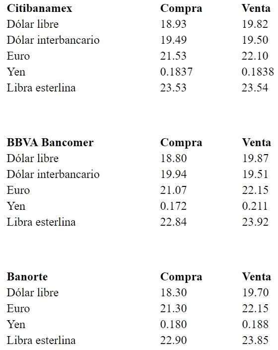 Este miércoles, el dólar libre se vende en un precio máximo de 19.87 pesos, 11 centavos más en relación con el cierre de ayer, y se compra en un mínimo de 18.30 pesos en sucursales bancarias de la Ciudad de México.De acuerdo con Banco Base, el peso inicia la sesión con una depreciación ante un regreso de la aversión al riesgo a los mercados financieros globales, luego de la publicación de indicadores económicos desfavorables en Europa.Explicó que debido a que los indicadores económicos señalan que la economía global está siendo afectada por la guerra comercial, los mercados financieros reaccionan negativamente. En el mercado cambiario, nuevamente pierden las divisas de economías emergentes y de países productores de materias primas.A esto, se suman las noticias como la decisión del presidente de Estado Unidos, Donald Trump, de postergar la entrada en vigor de unos aranceles a China.Hacia adelante se espera que la economía real a nivel global siga desacelerándose como consecuencia de la guerra comercial, lo que dificultará que el peso mexicano se recupere frente al dólar de forma sostenida en los próximos meses.Durante la sesión, se espera que el tipo de cambio cotice entre 19.40 y 19.65 pesos por dólar.A su vez, el Banco de México (Banxico) informa en el Diario Oficial de la Federación (DOF) que el tipo de cambio para solventar operaciones denominadas en moneda extranjera pagaderas en el país se ubica en 19.4630 pesos por dólar.Asimismo, indica que las Tasas de Interés Interbancarias de Equilibrio (TIIE) a 28 y 91 días se ubican en 8.4355 y 8.3859 por ciento, ambas con un retroceso de 0.0050 y 0.0059 puntos porcentuales, respectivamente.AC