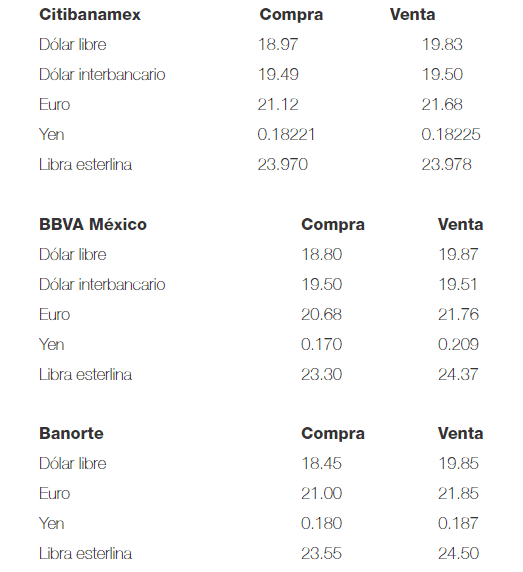 Esta mañana, el dólar libre abre la jornada en un precio máximo de 19.87 pesos, es decir, 15 centavos menos respecto al cierre de ayer, y se compra en un mínimo de 18.45 pesos en bancos de la capital.En opinión de Banco Base, el peso inicia la sesión con una apreciación, extendiendo su avance tras la publicación en Estados Unidos de las estadísticas de empleo correspondientes a septiembre.Asimismo, la nómina no agrícola mostró la creación de 136 mil posiciones laborales y el crecimiento mensual de los salarios promedio por hora fue de 0 por ciento, lo que fortalece la expectativa de que la Reserva Federal (Fed) vuelva a recortar la tasa de interés antes de que termine el año.Ello, indica, contribuye con la apreciación del peso y la mayoría de las divisas en la canasta de principales cruces.Precisa que en la sesión será clave la participación de Jerome Powell, presidente de la Fed, en un evento en Washington, programado para hoy, donde se hablará de las estrategias de política monetaria de esta institución central.La institución financiera refiere que para la sesión se espera que el tipo de cambio cotice entre 19.40 y 19.60 pesos por dólar.Por su parte, el Banco de México (Banxico) publica en el Diario Oficial de la Federación (DOF) que el tipo de cambio para solventar operaciones denominadas en moneda extranjera pagaderas en el país se ubica en 19.7368 pesos por dólar.En tanto, las Tasas de Interés Interbancarias de Equilibrio (TIIE) a 28 y 91 se ubican en 8.0075 y 7.9200, respectivamente, ambas con descensos, la primera de 0.0075 puntos porcentuales y la segunda de 0.0050 puntos.NR