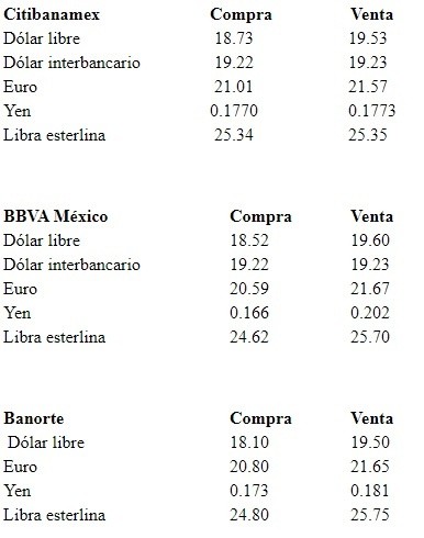 El dólar libre abre esta mañana en un precio máximo de 19.60 pesos, lo que representa un ligero avance de un centavo respecto al cierre de ayer, y se compra en un mínimo de 18.10 pesos en bancos de la Ciudad de México.De acuerdo con Banco Base, el peso inicia la sesión con pocos cambios.Asimismo, señala que por la mañana, el presidente Andrés Manuel López Obrador dijo en su conferencia matutina que México, Canadá y Estados Unidos alcanzaron un acuerdo sobre los cambios al T-MEC y hoy será firmado, y ahora el Congreso de Estados Unidos debe ratificarlo.La institución financiera precisa que durante la sesión el mercado estará atento a la reunión en México, en donde participarán el representante comercial de Estados Unidos, Robert Lighthizer, el asesor de la Casa Blanca, Jared Kushner, la viceprimera ministra canadiense Chrystia Freeland y oficiales mexicanos.La reunión programada para el mediodía será seguida de cerca por los mercados, pues es donde se espera hagan oficial el acuerdo entre los tres países, indica.El mercado también estará atento al Congreso estadounidense, luego de que se lleva a cabo una conferencia de prensa con la líder demócrata Nancy Pelosi y el presidente del Comité de Medios y Arbitrios, Richard Neal, en donde hablarán sobre el proceso de ratificación del T-MEC.En ese sentido, lo que se diga en la conferencia de prensa será clave para el desempeño del mercado cambiario. “Ya con el acuerdo entre los tres países y confirmándose la ratificación del T-MEC en Estados Unidos, es probable que el tipo de cambio baje inclusive de 19.00 pesos por dólar”.Por otro lado, destacó esta mañana se dio a conocer en medios que los gobiernos de China y Estados Unidos trabajan para aplazar los aranceles programados para entrar en vigor el próximo 15 de diciembre.Durante la sesión, se espera que el tipo de cambio cotice entre 19.10 y 19.30 pesos por dólar.A su vez, el Banco de México publica en el Diario Oficial de la Federación (DOF) que el tipo de cambio para solventar operaciones denominadas en moneda extranjera pagaderas en el país se ubica en 19.2302 pesos por dólar.En tanto, las Tasas de Interés Interbancarias de Equilibrio (TIIE) a 28 y 91 días se ubican en 7.7460 y 7.6125, respectivamente, ambas con descenso, de 0.0250 y 0.0020 puntos porcentuales, en ese orden.AC