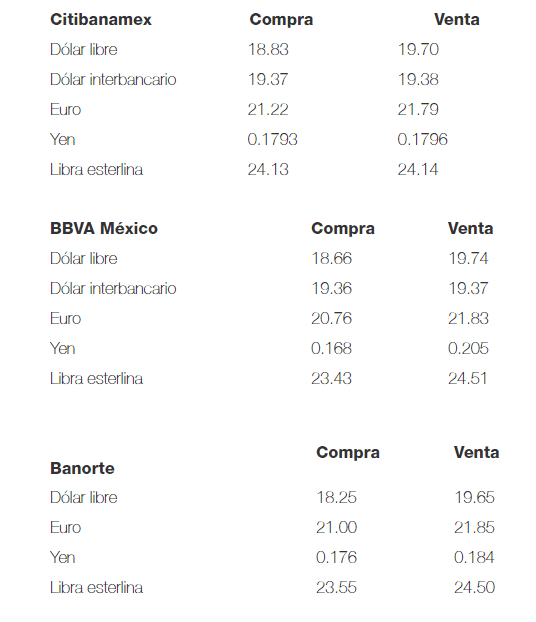El último día de la semana, el dólar libre abre la jornada con marginal pérdida, al venderse en un precio máximo de 19.74 pesos, es decir dos centavos menos respecto al cierre previo, y se compra en un mínimo de 18.25 pesos en bancos de la Ciudad de México.En opinión de Banco Base, el peso mexicano inicia la sesión con una apreciación debido a un mayor optimismo respecto a la relación comercial entre Estados Unidos y China.Explica que esta mañana se dio a conocer que el Ministerio de Comercio de China está respaldando la compra de productos agrícolas estadounidenses como la soya y la carne de cerdo, ello como parte de una estrategia para reducir las tensiones comerciales con Estados Unidos previo a su reunión a principios de octubre.A ello, agrega, se suma a los comentarios recientes por parte de ambos gobiernos sobre la aplicación y/o suspensión temporal de barreras comerciales.Por otra parte, ayer el presidente de Estados Unidos, Donald Trump, dijo que prepara un recorte de impuestos para la clase media para el próximo año, en el que se celebrarán las elecciones presidenciales de medio término.Lo anterior, refiere, fortalece la expectativa de que la economía de Estados Unidos podría seguir expandiéndose.La institución financiera indica que en la sesión de hoy se espera que el tipo de cambio cotice entre 19.30 y 19.50 pesos por dólar.A su vez, el Banco de México (Banxico) publicó en el Diario Oficial de la Federación (DOF) que el tipo de cambio para solventar operaciones denominadas en moneda extranjera pagaderas en el país se ubica en 19.4265 pesos por dólar.Asimismo, las Tasas de Interés Interbancarias de Equilibrio (TIIE) a 28 y 91 días se ubican en 8.2070 y 8.1212 por ciento, en ese orden, ambas con pérdida de 0.0030 y 0.0113 puntos porcentuales, respectivamente.NR