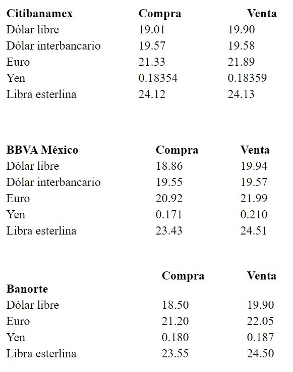 El último día de la semana, el dólar libre abre con una pérdida de 11 centavos respecto al cierre de ayer, al venderse en un precio máximo de 19.94 pesos, y se adquiere en un mínimo de 18.50 pesos en ventanillas bancarias de la Ciudad de México.En opinión de Banco Base, el peso inicia la sesión con una apreciación. La mayoría de los principales cruces frente al dólar siguen recuperando terreno, luego de que la divisa estadounidense se debilitó tras la publicación de indicadores labores de Estados Unidos.La institución financiera señala que esta mañana se publicó en dicha nación la nómina no agrícola correspondiente al mes de agosto, la cual mostró la creación de 130 mil posiciones laborales, dato que se ubicó muy por debajo de las expectativas del mercado y que es señal de debilidad en el mercado laboral; mientras que la tasa de desempleo se mantuvo.Dichos datos parecen mostrar que el mercado laboral está debilitándose, el cual se ve reflejado en el sector manufacturero.Posterior a la publicación del informe mensual del mercado laboral de Estados Unidos, los participantes del mercado centrarán su atención en la intervención de Jerome Powell, presidente de la Reserva Federal (Fed), en una conferencia en Zúrich, Suiza donde se esperan comentarios acerca de las perspectivas económicas y la política monetaria de Estados Unidos.Cabe recordar, indica, que esta será la última intervención pública de Powell previo al anuncio de política monetaria del próximo 18 de septiembre.Por otra parte, en México se publicaron las cifras de inversión fija bruta de junio, las cuales mostraron nuevamente una caída, lo que evidencia la existencia de riesgos para la economía mexicana que podrían seguir obstaculizando la apreciación del peso.Banco Base precisa que en la sesión de hoy se espera que el tipo de cambio cotice entre 19.45 y 19.65 pesos por dólar.El Banco de México (Banxico) informa en el Diario Oficial de la Federación (DOF) que el tipo de cambio para solventar operaciones denominadas en moneda extranjera pagaderas en el país se ubica en 19.6834 pesos por dólar.En tanto, las Tasas de Interés Interbancarias de Equilibrio (TIIE) a 28 y 91 días se ubican en 8.2230 y 8.1775 por ciento, en ese orden, ambas con retrocesos, de 0.0120 y 0.0075 puntos porcentuales, respectivamente.AC