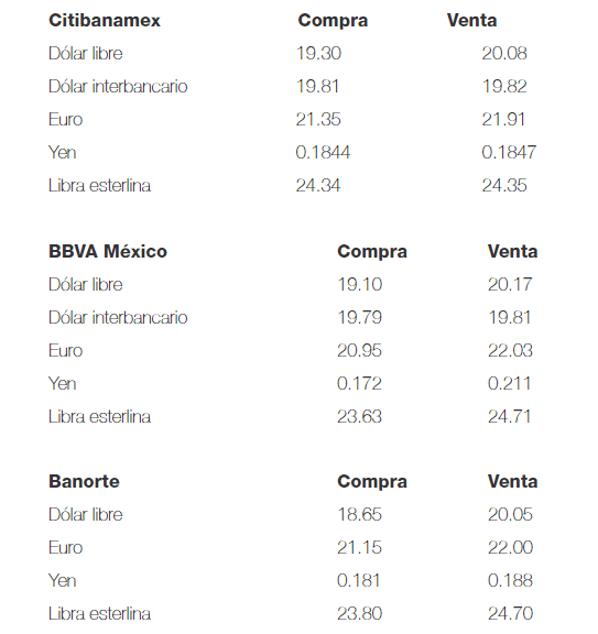 Esta mañana, el dólar libre abre la jornada en un precio máximo a la venta de 20.17 pesos, sin cambios respecto al cierre de ayer, y se adquiere en un mínimo de 18.65 pesos en bancos de la Ciudad de México.En opinión de Banco Base, ayer el tipo de cambio enfrentó presiones al alza ante una mayor percepción de riesgo para el crecimiento económico global, tras publicarse el dato del ISM manufacturero de Estados Unidos de septiembre, el cual se ubicó en zona de contracción y en su peor nivel desde junio de 2009.La institución financiera señala que el peso, el cual inicia la jornada con apreciación modera, no fue el único que mostró avance durante las primeras horas de la mañana, sino también el rand sudafricano que ganó por motivos políticos internos.Refiere que el peso es de las pocas divisas que se recuperan esta mañana, pues el dólar estadounidense se mantiene fuerte frente a la mayoría de los principales cruces.Sin embargo, agrega, no se descartan presiones al alza sobre el tipo de cambio, sobre todo pensando que octubre es un mes en donde históricamente se ha dado una mayor volatilidad y el peso se deprecia.Banco Base indica que en la sesión se espera que el tipo de cambio cotice entre 19.75 y 19.90 pesos por dólar.Por su parte, el Banco de México (Banxico) publica en el Diario Oficial de la Federación (DOF) que el tipo de cambio para solventar operaciones denominadas en moneda extranjera pagaderas en el país se ubica en 19.7792 pesos por dólar.Las Tasas de Interés Interbancarias de Equilibrio (TIIE) a 28 y 90 días se ubican en 8.0150 y 7.9275, respectivamente, ambas con pérdidas de 0.0125 y 0.0025 puntos porcentuales, en ese orden.NR