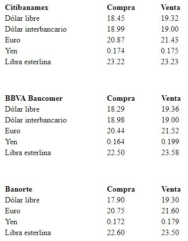 Esta mañana, bancos de la Ciudad de México venden el dólar libre en un precio máximo de 19.36 pesos, es decir, siete centavos menos respecto al cierre de ayer, y lo compran en un mínimo de 17.90 pesos.De acuerdo con Banco Base, el peso inicia la sesión con apreciación luego de que se publicó la estimación oportuna de crecimiento económico de México del segundo trimestre, dato que superó las expectativas del mercado.Señala que la economía del país creció a una tasa trimestral de 0.05 por ciento, esquivando el negativo de dos caídas consecutivas que hubieran dado pie a especulaciones de que se está en una recesión técnica; el crecimiento anual se ubicó en una tasa de 0.38 por ciento, según cifras ajustadas por estacionalidad.La entidad financiera precisa que el crecimiento positivo de la economía mexicana durante el segundo trimestre y las acciones para apoyar a la economía anunciadas por Hacienda mejoran la perspectiva de crecimiento para este año.Hacia adelante será fundamental que haya mayor certidumbre para que la inversión pueda recuperarse y así permitir a la economía crecer a tasas mayores, y será clave que el gasto de gobierno se reactive.En ese contexto, se espera que durante la mañana el tipo de cambio cotice con estabilidad cerca de 19 pesos por dólar, debido a que participantes del mercado permanecen a la espera del anuncio de política monetaria de la Reserva Federal.De igual forma, subrayó, serán importantes los comentarios del presidente de la Reserva Federal, Jerome Powell, pues de haber un recorte en la tasa de interés el mercado podría especular sobre el inicio de un ciclo acomodaticio por parte de la Reserva Federal (Fed).A su vez, el Banco de México (Banxico) informa en el Diario Oficial de la Federación (DOF) que el tipo de cambio para solventar operaciones denominadas en moneda extranjera pagaderas en el país se ubica en 19.0747 pesos.En tanto, las Tasas de Interés Interbancarias de Equilibrio (TIIE) a 28 y 91 días se colocan en 8.4650 y 8.4155 por ciento, respectivamente, ambas con pérdida de 0.0025 y 0.0045 puntos porcentuales, respectivamente.