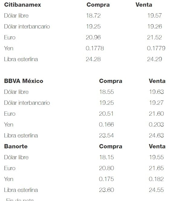 Este lunes, el dólar libre abre en un precio máximo de 19.63 pesos, lo que representa tres centavos menos frente al cierre del viernes, y se compra en un mínimo de 18.15 pesos en bancos de la capital.En opinión de Banco Base, el peso inicia la sesión mostrando una apreciación moderada; mientras los participantes del mercado siguen evaluando el entendimiento comercial alcanzado entre China y Estados Unidos al cierre de la semana pasada.Señala que aunque el tipo de cambio peso-dólar cotiza con estabilidad, la mayoría de las divisas pierden terreno. Asimismo, los mercados de capitales en Europa muestran pérdidas, tras haber recuperado terreno al cierre de la semana anterior.La institución financiera indica que en la semana se publicará poca información económica relevante en México. Sin embargo, en Estados Unidos el miércoles se darán a conocer las ventas minoristas de septiembre y el jueves los indicadores del mercado inmobiliario para el mismo mes.Respecto a los indicadores económicos de México, este fin de semana el IMSS dio a conocer que en septiembre se crearon 145 mil 416 empleos formales, el cuarto mayor aumento para un mes igual desde que la serie se comenzó a publicar en 1997.Con lo anterior, destaca, en el año se acumula la creación de 488 mil 061 empleos y además se genera la expectativa de que la economía mexicana podría estar empezando a mostrar un impulso después de la marcada desaceleración económica desde inicios de año.Banco Base informa que en la sesión, se espera que el tipo de cambio cotice entre 19.25 y 19.35 pesos por dólar.A su vez, el Banco de México publica en el Diario Oficial de la Federación (DOF) que el tipo de cambio para solventar operaciones denominadas en moneda extranjera pagaderas en el país se ubica en 19.3217 pesos por dólar.En tanto, las Tasas de Interés Interbancarias de Equilibrio (TIIE) a 28 y 91 días se ubican en 8.0025 y 7.9137, respectivamente, ambas con descenso, la primera con pérdida de 0.0025 puntos y la segunda con 0.0038 puntos porcentuales.AC