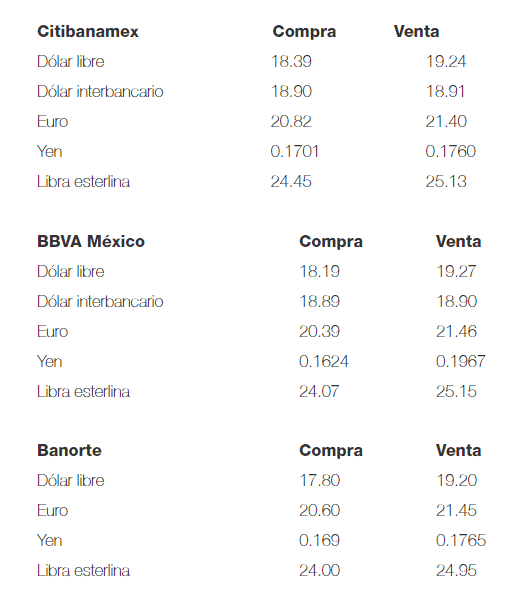 El dólar libre se vende en un precio máximo de 19.27 pesos, es decir, dos centavos menos con respecto al cierre previo, y se adquiere en un mínimo de 17.80 pesos en bancos de la Ciudad de México.A su vez, el Banco de México (Banxico) publicó en el Diario Oficial de la federación (DOF) que el tipo de cambio para solventar operaciones denominadas en moneda extranjera pagaderas en el país se ubica en 18.9445 pesos por dólar.En tanto, las Tasas de Interés Interbancarias de Equilibrio (TIIE) a 28 y 91 días se colocan en 7.5625 y 7.4550 por ciento, ambas con retroceso de 0.0025 puntos porcentuales de forma respectiva.NR