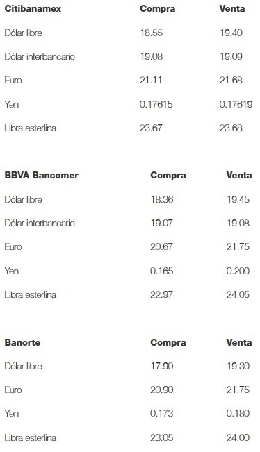 Al cierre de la jornada cambiaria de este martes, el dólar libre se vendió hasta en 19.45 pesos, nueve centavos más en comparación con el cierre de ayer, y se compró en un mínimo de 17.90 pesos en bancos de la Ciudad de México.A su vez, el Banco de México (Banxico) fijó en 19.0781 pesos el tipo de cambio para solventar obligaciones denominadas en moneda extranjera pagaderas en el país.• Dólar recupera terreno, abre en 19.42 pesos a la venta en bancosJM