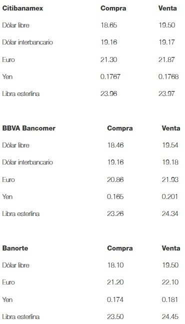 Este miércoles, el dólar libre concluyó la sesión con un avance de cuatro centavos en comparación con el cierre de ayer, al venderse en un precio máximo de 19.54 pesos, y se compró en un mínimo de 18.10 pesos en bancos de la Ciudad de México.A su vez, el Banco de México (Banxico) fijó en 19.2425 pesos el tipo de cambio para solventar obligaciones denominadas en moneda extranjera pagaderas en el país.• Dólar abre al alza, se vende hasta en 19.65 pesos en bancosJM