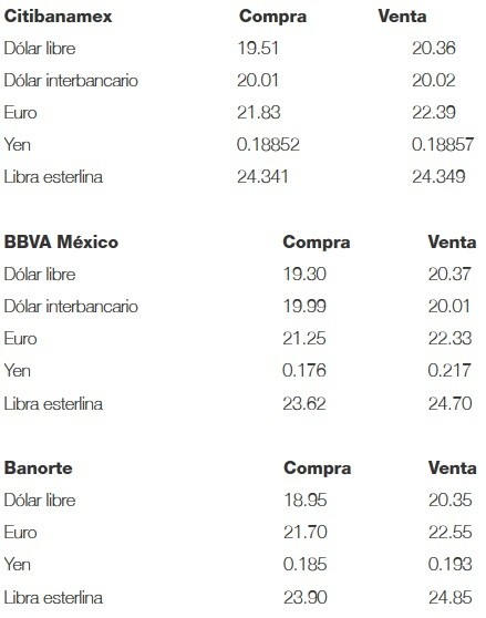 En la última jornada cambiaria de la semana, el dólar libre se vendió en un precio máximo en 20.37 pesos, lo que representó un retroceso de 12 centavos respecto al cierre previo, y se compró en precio mínimo 18.95 pesos en bancos de la Ciudad de México.El Banco de México (Banxico) fijó en 20.0696 pesos el tipo de cambio para solventar obligaciones denominadas en moneda extranjera pagaderas en el país.• Dólar cede terreno; abre en 20.45 pesos a la ventaJM