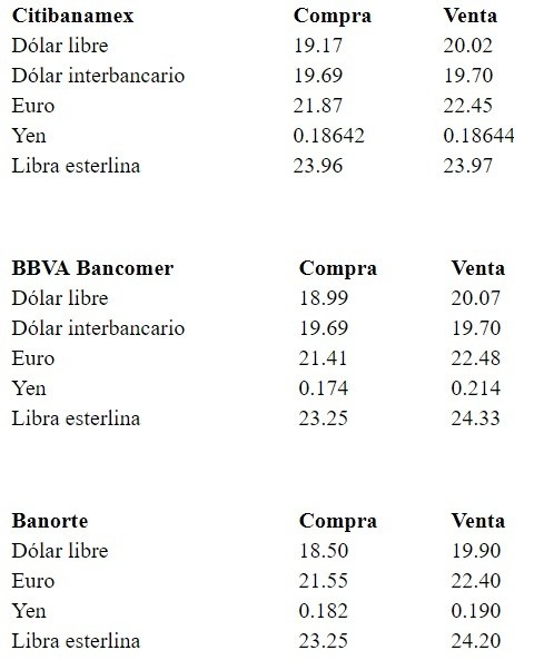 El dólar libre abre la sesión de por arriba de la barrera de los 20 pesos, al venderse hasta en 20.07 pesos, es decir, 14 centavos más en comparación con el cierre anterior y se compra en un precio mínimo de 18.50 pesos en sucursales bancarias de la capital.En opinión de Banco Base, el peso inicia la sesión con una depreciación, perdiendo nuevamente junto a la mayoría de las divisas de economías emergentes, ante el riesgo de que la economía global continúe desacelerándose.Este miércoles, señala, tres bancos centrales tomaron la decisión de recortar su tasa de interés: el Banco de Nueva Zelanda, el Banco de la Reserva de la India y el Banco de Tailandia.Las decisiones de los bancos centrales de adoptar una política monetaria más flexible, envían dos señales importantes al mercado, una, que existen riesgos a la baja para el crecimiento económico a nivel global, y dos, que se ha comenzado a especular sobre el riesgo de una guerra de divisas.Y si bien, agrega, la mayoría de bancos centrales tienen como mandato principal el control de la inflación, la adopción de una postura monetaria más acomodaticia por parte de un banco central tiende a generar presiones en contra de su divisa.Ello puede ser interpretado por el presidente de Estados Unidos, Donald Trump, como un esfuerzo por favorecer sus exportaciones de forma desleal, lo que podría deteriorar aún más la relación comercial entre este país y sus principales socios comerciales.Durante la sesión, se espera que el tipo de cambio cotice entre 19.55 y 19.75 pesos por dólar.A su vez, el Banco de México (Banxico) informa en el Diario Oficial de la Federación (DOF) que el tipo de cambio para solventar operaciones denominadas en moneda extranjera pagaderas en el país se ubica en 19.6291 pesos.En tanto, las Tasas de Interés Interbancarias de Equilibrio (TIIE) a 28 y 91 días se ubican en 8.4537 y 8.4050 por ciento, la primera con un retroceso de 0.0038 puntos, y la segunda con avance de 0.0175 puntos porcentuales, en ese orden.AC