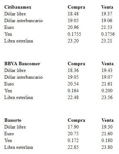 El dólar libre inicia la sesión con una ligera alza de un centavo más en comparación con el cierre de ayer, se vende hasta en 19.43 pesos y se compra en un mínimo de 17.90 pesos, en bancos de la Ciudad de México.En opinión de Banco Base, el peso inicia la sesión mostrando una apreciación moderada mientras el mercado se mantiene a la espera del anuncio de política monetaria de la Reserva Federal, programado para el día de mañana, en donde se anticipa un recorte a la tasa de interés.Asimismo, en México, los participantes del mercado están atentos a la publicación del crecimiento económico durante el segundo trimestre, dato que se dará a conocer este miércoles a las 6:00 horas, y donde existe una alta posibilidad de que se confirme una segunda contracción trimestral consecutiva del Producto Interno Bruto.Debido a las señales de una desaceleración económica severa en México, la Secretaría de Hacienda (SHCP) anunció ayer por la tarde un paquete de 485 mil millones de pesos para incentivar la economía.Detalló que este plan propone que se destinen 50 mil millones de pesos para acelerar proyectos de inversión, 320 mil millones de pesos para incentivar la inversión y el consumo por medio de 1.2 millones de créditos, 116 mil millones de pesos para acelerar contrataciones y licitaciones que habían sido programadas para el siguiente año.La institución financiera agregó que durante la sesión se espera que el tipo de cambio cotice entre 19.00 y 19.15 pesos por dólar.A su vez, el Banco de México (Banxico) informa en el Diario Oficial de la Federación (DOF) que el tipo de cambio para solventar operaciones denominadas en moneda extranjera pagaderas en el país se ubica en 19.0900 pesos.En tanto, las Tasas de Interés Interbancarias de Equilibrio (TIIE) a 28 y 91 días se colocan en 8.4675 y 8.4200 por ciento, respectivamente, ambas con pérdida de 0.0025 y 0.0006 puntos porcentuales, respectivamente.OA