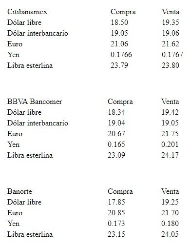 Este lunes, el dólar libre abre con un avance de cinco centavos respecto al cierre del viernes, al venderse hasta en 19.42 pesos, y se adquiere en un precio mínimo de 17.85 pesos en bancos de la Ciudad de México.De acuerdo con Banco Base, al inicio de la semana, las divisas muestran un desempeño mixto, debido a que hoy se publica poca información económica relevante y los participantes del mercado están atentos al anuncio de política monetaria de la Reserva Federal (Fed), programada para el próximo 31 de julio.Subraya que se especula que el Comité Federal de Mercado Abierto (FOMC, por sus siglas en inglés) recorte la tasa de interés en 25 puntos base, de un rango entre 2.25 y 2.50 por ciento a uno entre 2.00 y 2.25 por ciento, por lo que es probable que el dólar pierda terreno frente a sus principales cruces.En la semana sí se publicará información económica relevante, en México se dará a conocer la inflación de la primera quincena de julio y el Indicador Global de Actividad Económica (IGAE), dato clave, toda vez que confirmaría si en el segundo trimestre se dio una recesión en el país.Mientras que el próximo 31 de julio se informará el crecimiento del Producto Interno Bruto (PIB) de México.Por otra parte, en Estados Unidos se publicarán datos económicos importantes durante la semana, como el crecimiento económico del segundo trimestre, el próximo 26 de julio, lo que influirá en la decisión de la Reserva Federal.En ese contexto, precisa la institución financiera, se espera que durante la sesión el tipo de cambio cotice entre 18.95 y 19.10 pesos por dólar.A su vez, el Banco de México (Banxico) informa en el Diario Oficial de la Federación (DOF) que el tipo de cambio para solventar operaciones denominadas en moneda extranjera pagaderas en el país se ubica en 19.0123 pesos.Asimismo, las Tasas de Interés Interbancarias de Equilibrio (TIIE) a 28 y 91 días se colocan en 8.4775 y 8.4506 por ciento, ambas con ganancia, de 0.0025 y 0.0031, respectivamente.OA